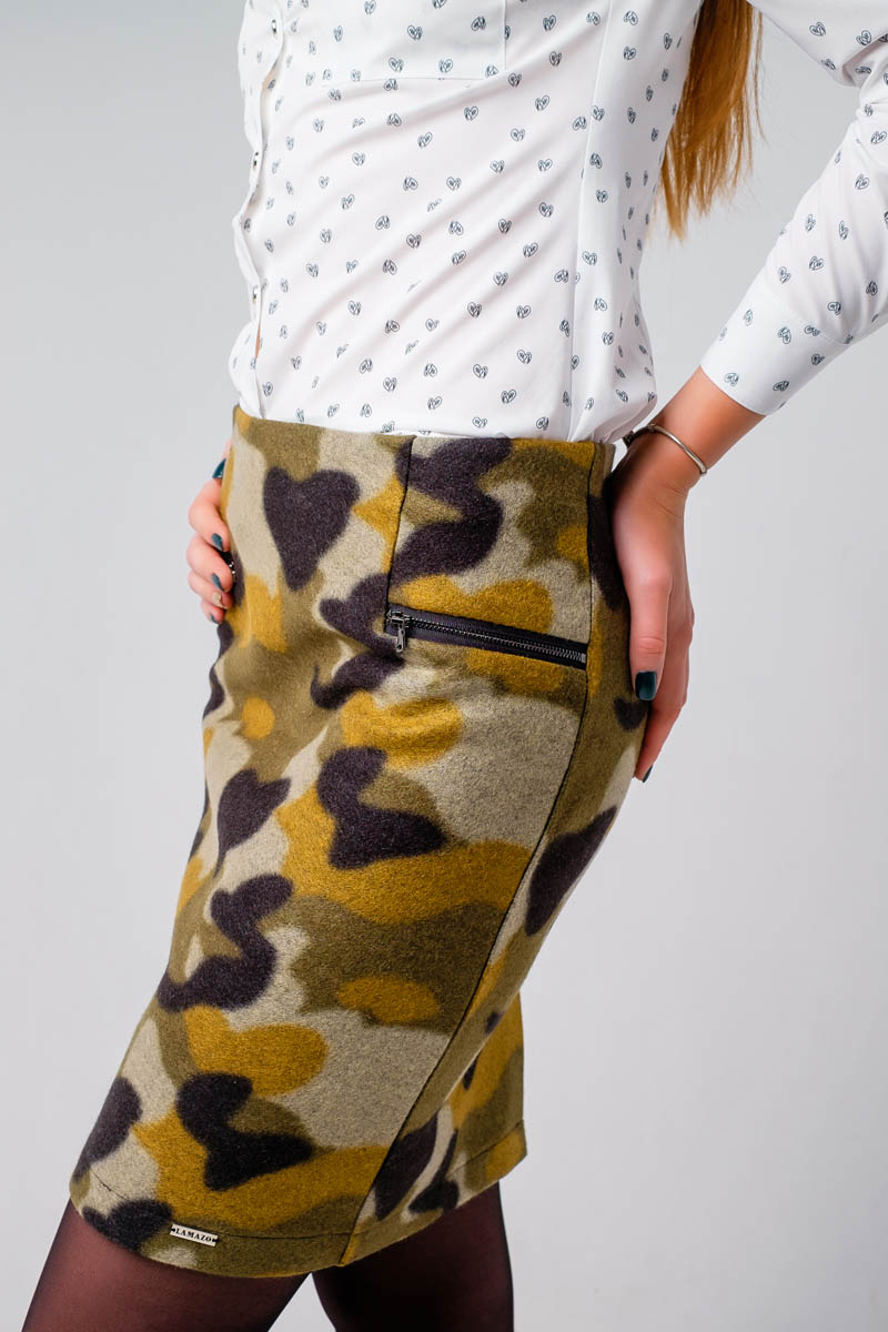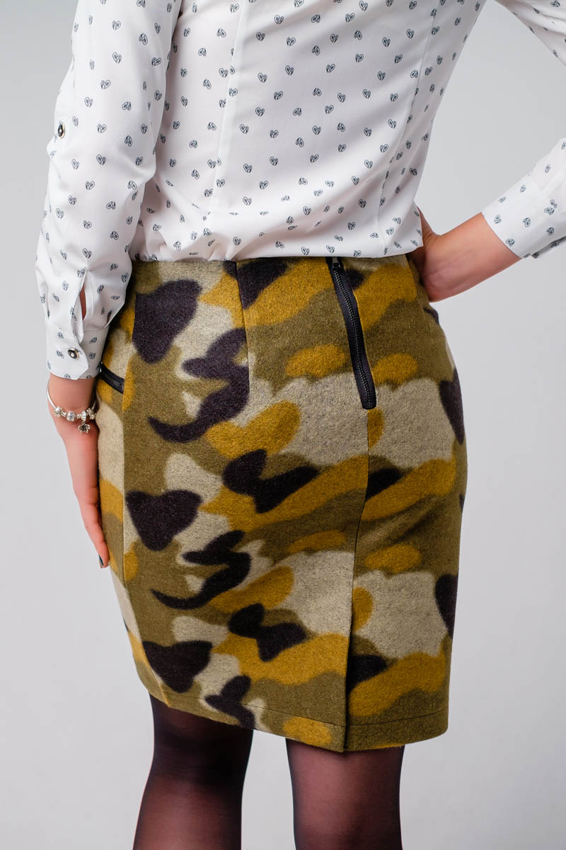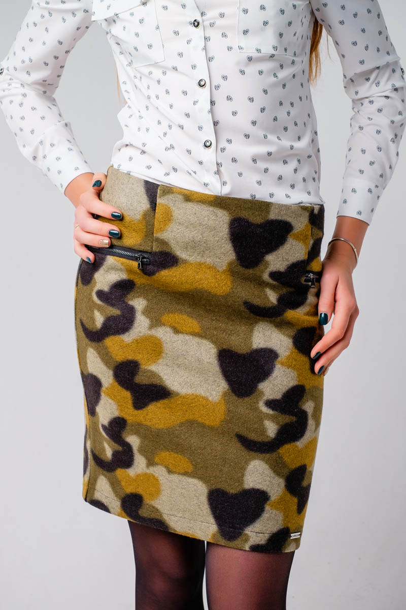 Юбка женская классическая из драпа, длиной чуть выше колен, зауженная к низу. На переднем полотнище расположены карманы с застежкой-молнией(имитация). По заднему полотнищу расположена шлица и застежка на декоративной молнии. Состав: хлопок 70%, полиэстер 30%.