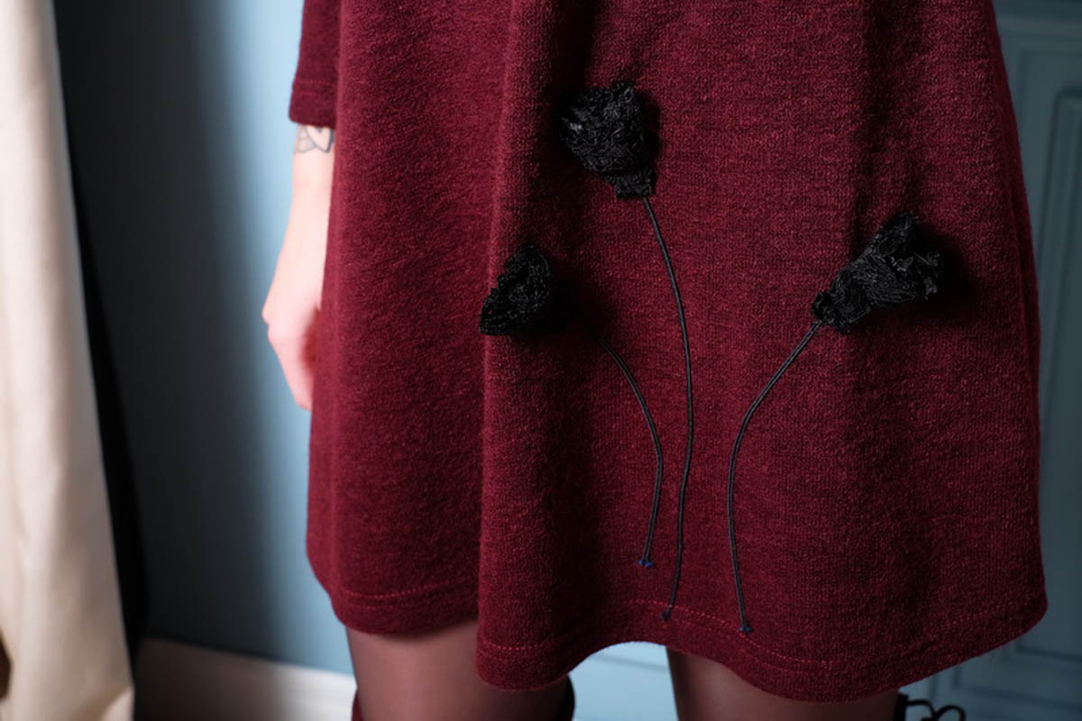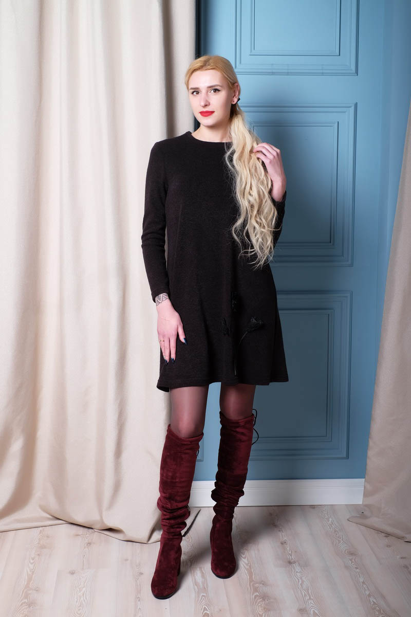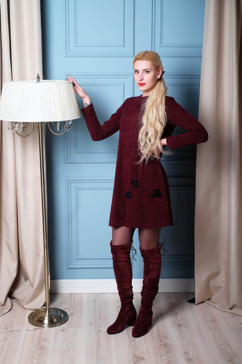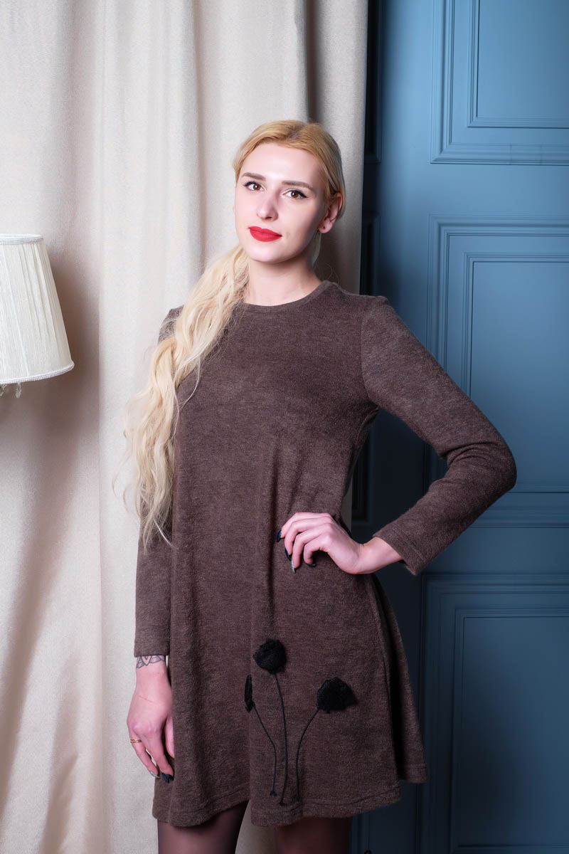 Платье женское А-силуэта из ангоровой ткани. В качестве декора использованы 3 цветка внизу изделия Состав: 95 % полиэстер, 5% хлопок.Длина изделия 100 см.