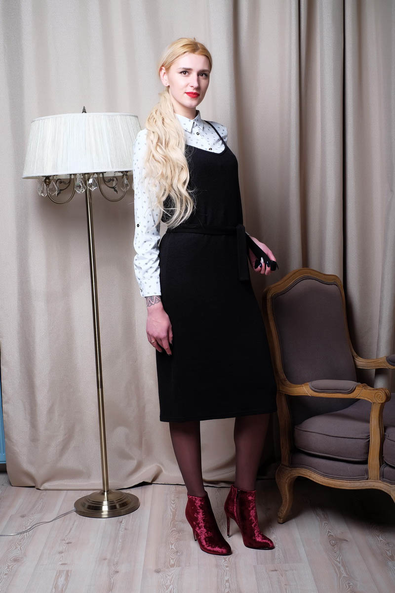 Платье женское прямого силуэта немного расширенное к низу. На плечах крепится бретелями,выполнено из ангоровой ткани. Хорошо смотрится в сочетании с блузой. Длина изделия 95 см.