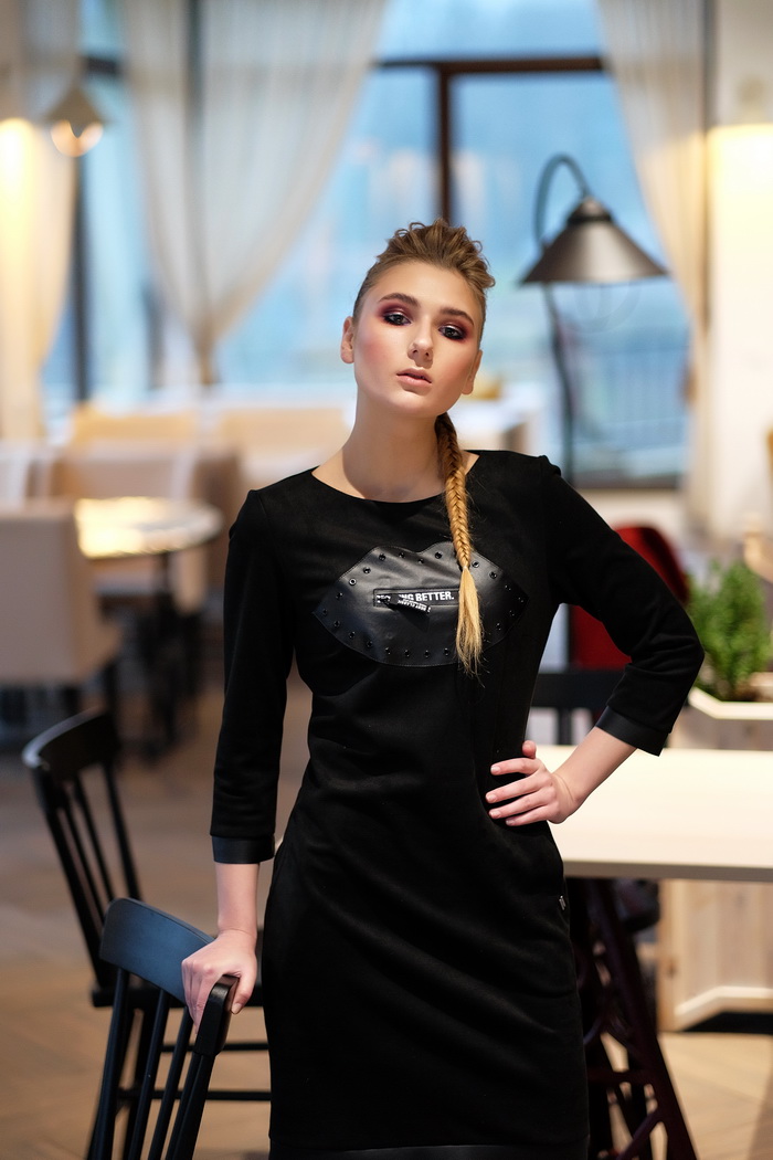 Платье женское прилегающее,выполнено из замша на трикотажной основе. По переду расположены карманы в боковых швах на уровне бедер. По низу рукавов и изделия расположена отделка из кожи/ резинка. На уровне груди располагается декоративная отделка губы с прорезным карманом/накладной кармашек из пайеток. Состав:: 95 % полиэстер, 5% спандекс. Длина изделия 89 см.