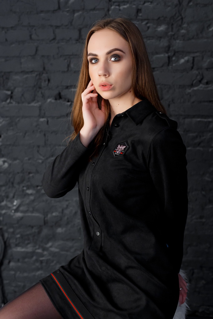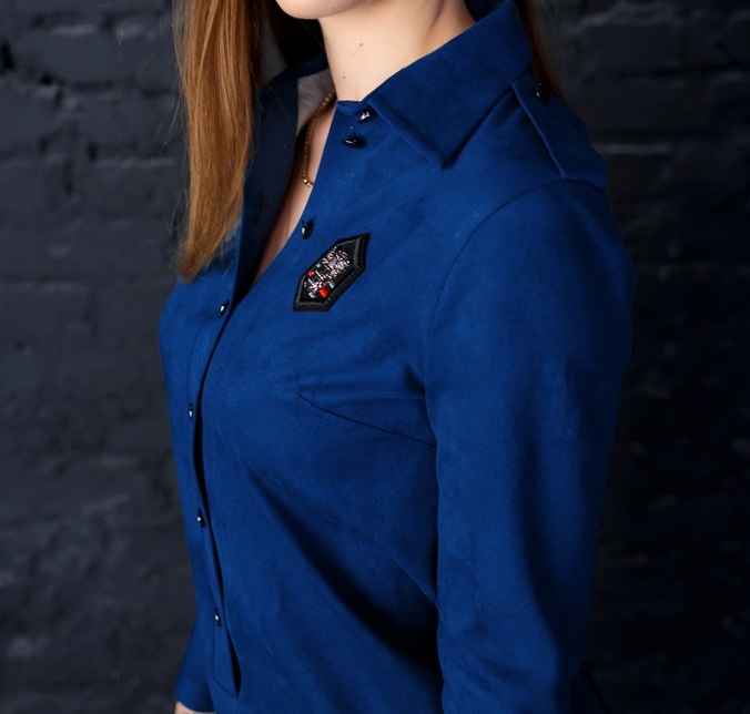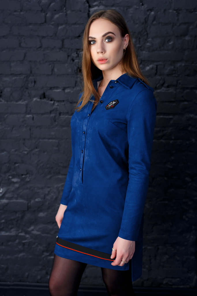 Платье женское прямого силуэтаиз из замшевой ткани с застежкой-планкой на 7 пуговиц. Рукав втачной,длинный. Низ изделия с отделочной резинкой; по переду короче на 4 см с разрезами в боковых швах. На уровне груди расположена декоративная нашивка, так же в качестве декора расположены по плечевым швам погоны с отделочной пуговицей. Воротник отложной на отрезной стойке. Длина изделия 89 см. Состав: Состав: хлопок 70%, полиэстер 30%.