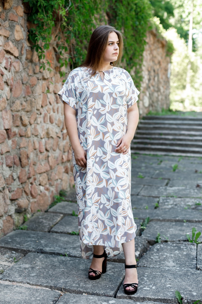 Платье прямого силуэта,длиной maxi. Рукав короткий,приспущен с манжетом. По переду V-образный вырез с фирменным декоративным элементом. По спинке глубокий вырез на завязках. Низ - фигурный, спинка длинее переда. В боковых швах - карманы. Длина изделия: 130 см. Состав: 70%- хлопок, 30%- полиэстер.
