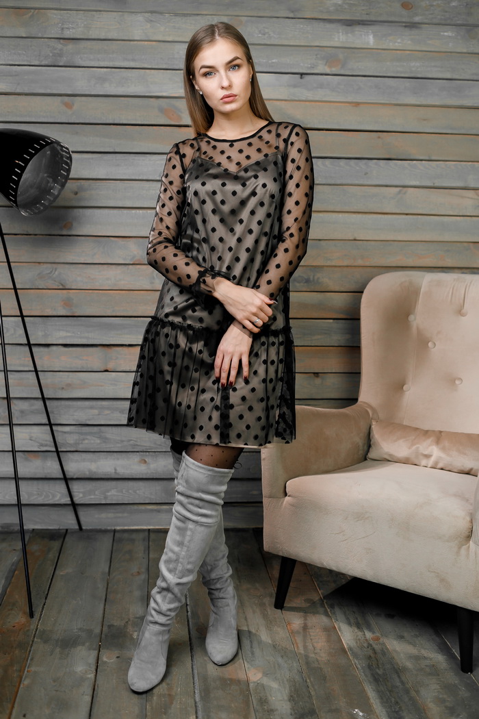 Комплект : верхнее платье - из ткани "сетка", расширенное к низу,длиной до колена. Горловина круглая, по спинке - застежка-слезка на 1 пуговицу. Рукав - длинный. По низу платья и рукава - присборенный валан. Нижнее платье - из креп-атласа, на бретелях. Длина изделия: нижнее 80-81 см; верхнее 89-90 см. Состав: 70%- хлопок, 30%- полиэстер.