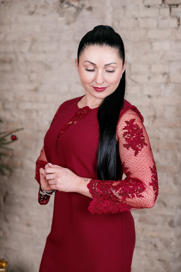 Платье женское полуприлегающего силуэта, длиной до колена.По переду на горловине треугольная гипюровая вставка. Рукав - втачной, 7/8, из гипюровой ткани. По спинке застежка- молния. Длина изделия 100-102 см. Состав: хлопок 70%, полиэстер 30%.