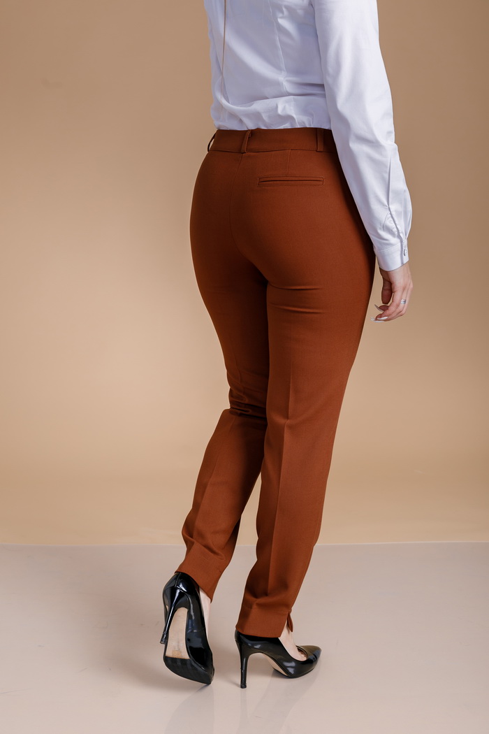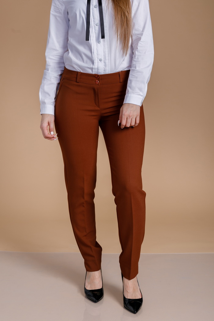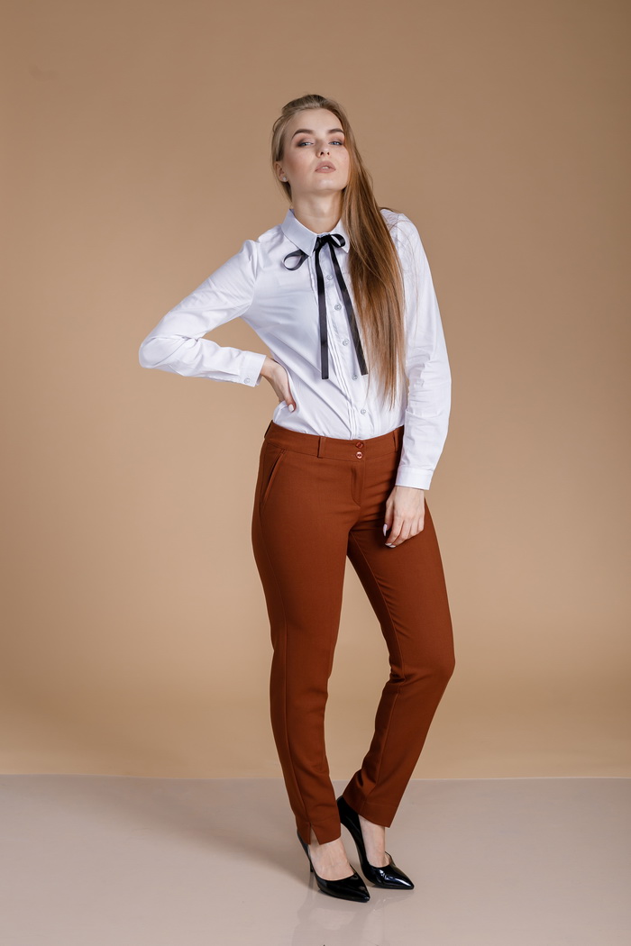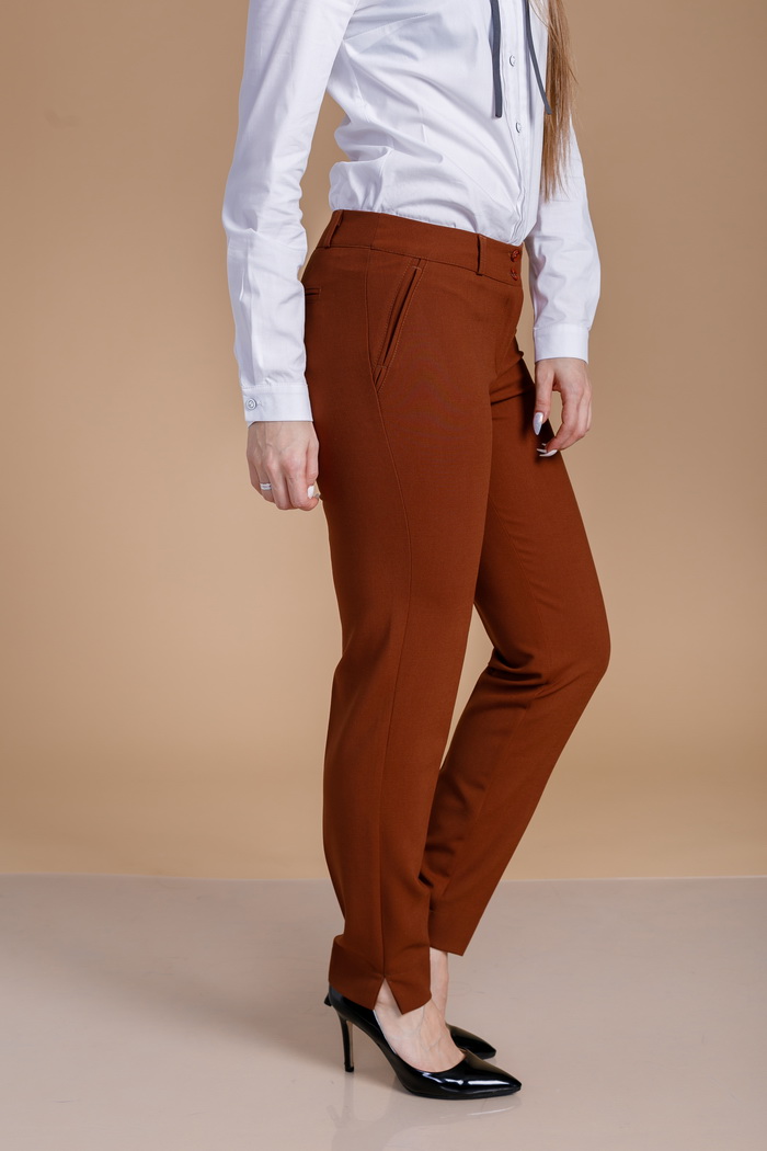 Брюки прямые, длинные, с высокими разрезами по низу в боковых швах .Спереди в боковых швах прорезные накладные карманы. На спинке карман-обманка.На поясе - шлевки. Длина изделия 100 см. Состав: хлопок 70%, полиэстер 30%.