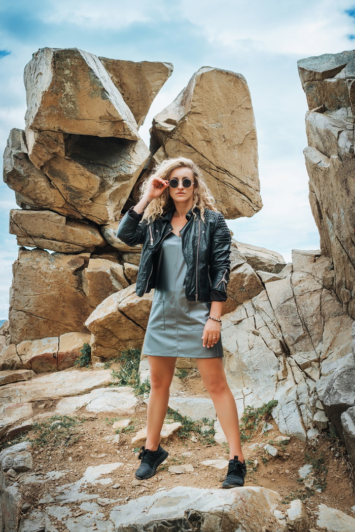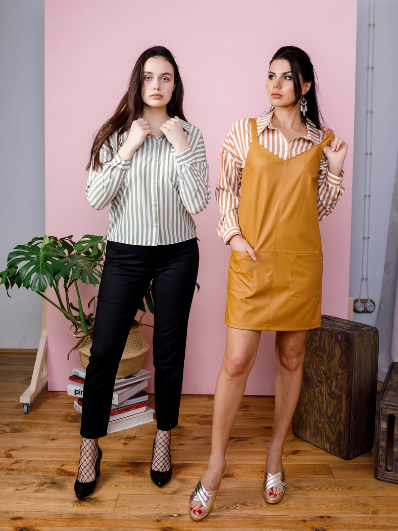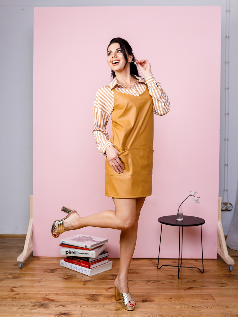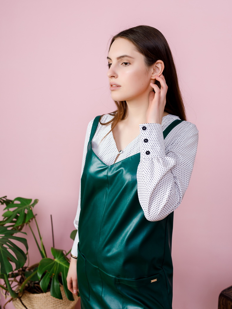 Сарафан из эко-кожи, на бретелях, длиной до колена, немного расширенного силуэта. По переду центра шов и подрез ниже уровня талии отстрочены отделочной строчкой. Спереди 2 накладных кармана. Длина изделия от ростка 79 см. Состав: 100 % полиэстер.
