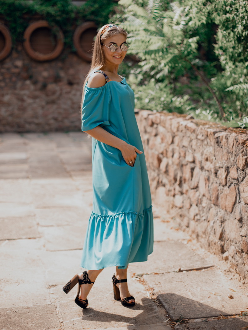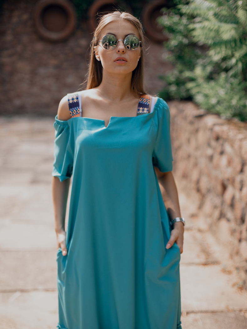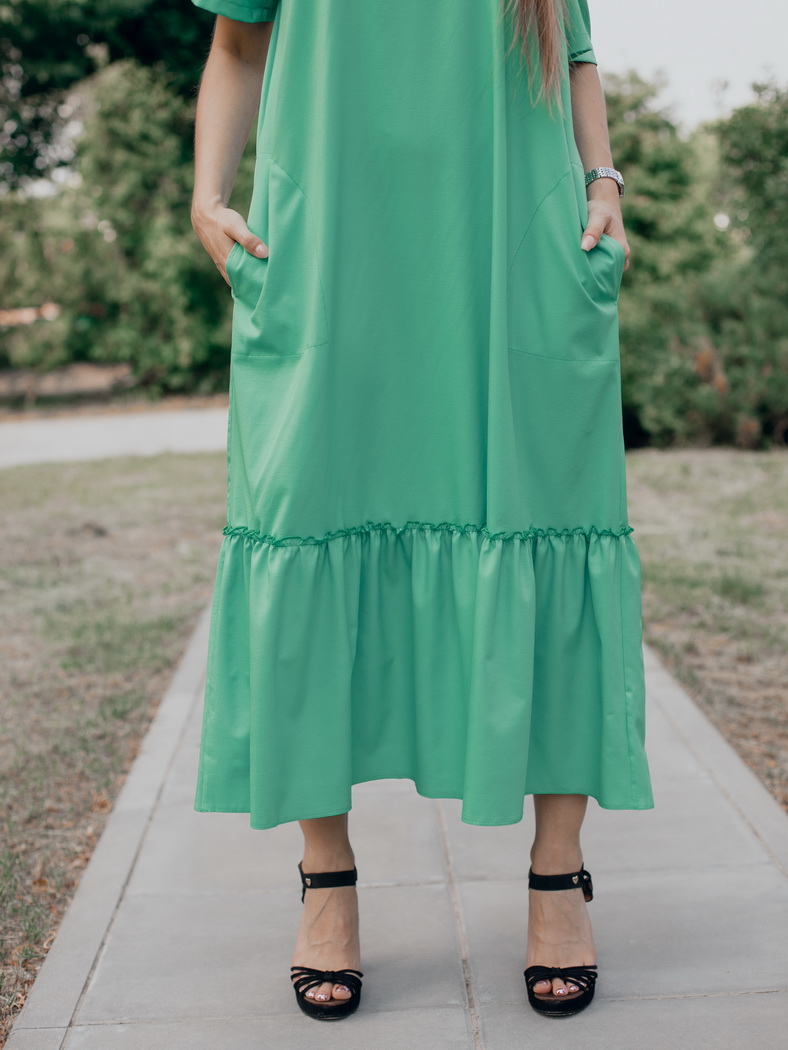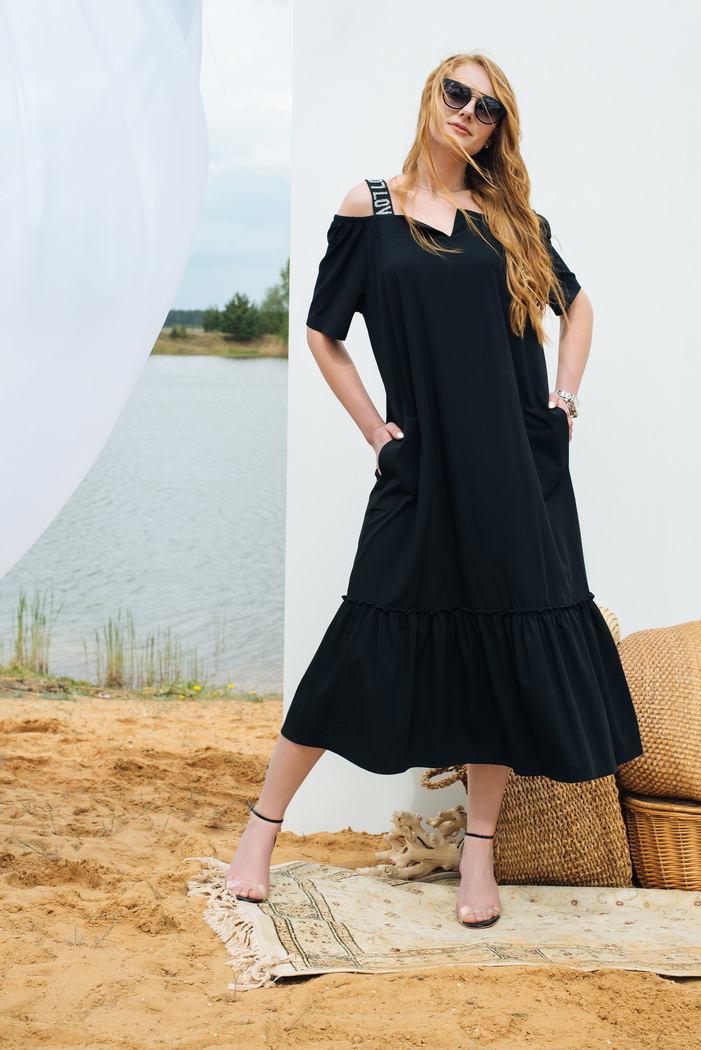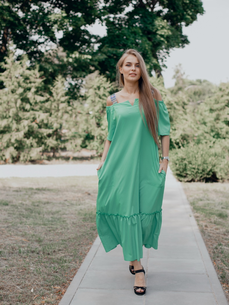 Платье длинное, слегка расширенного силуэта, на бретелях из отделочной тесьмы. перед открытый с V- образным разрезом. Спинка - открытая. По рукаву в верхней части резинка. Рукав - короткий. В боковых швах - карманы. По низу - широкий присборенный валан. С левой стороны переда под бретелью вставлена декоративная подвеска. Длина изделия : 127 см. Размеры: 48-54. Цвета: черно-белая полоска, черный, мята, морская волна, бежевый, коралловый. Состав: вискоза- 100%.