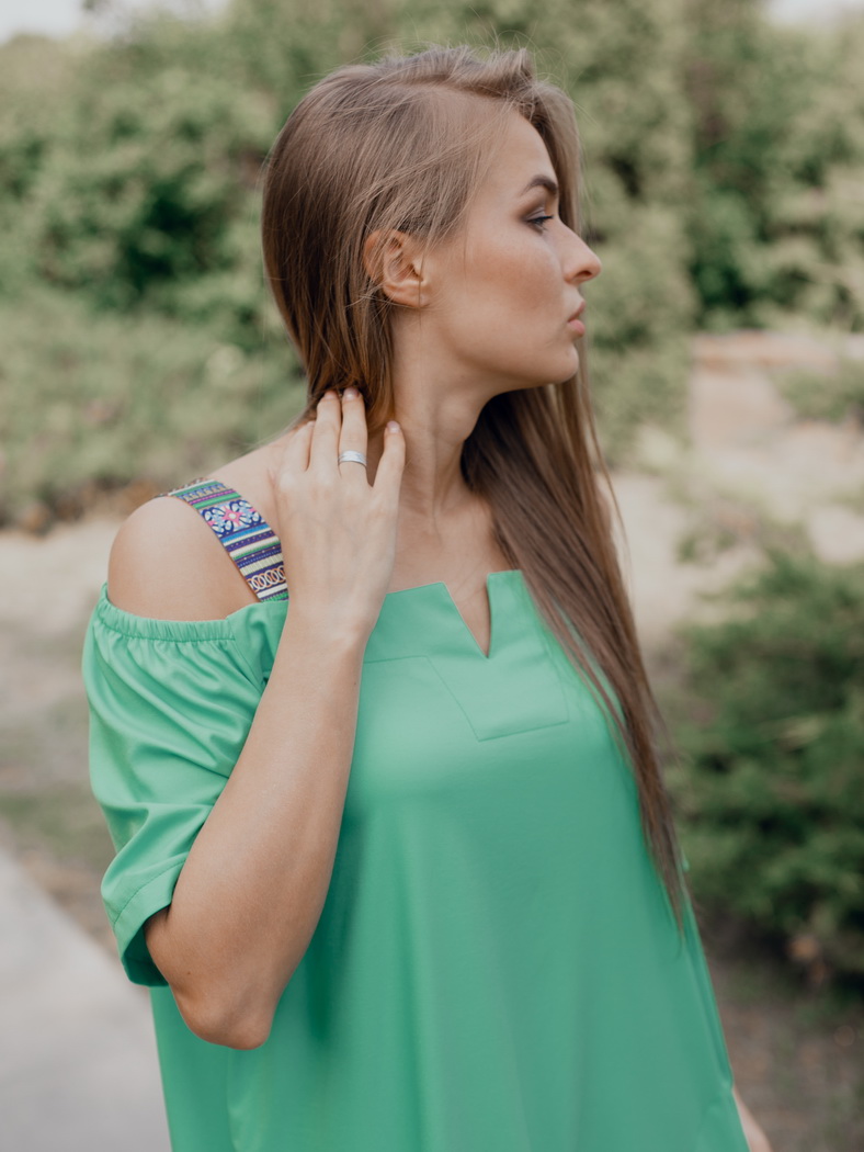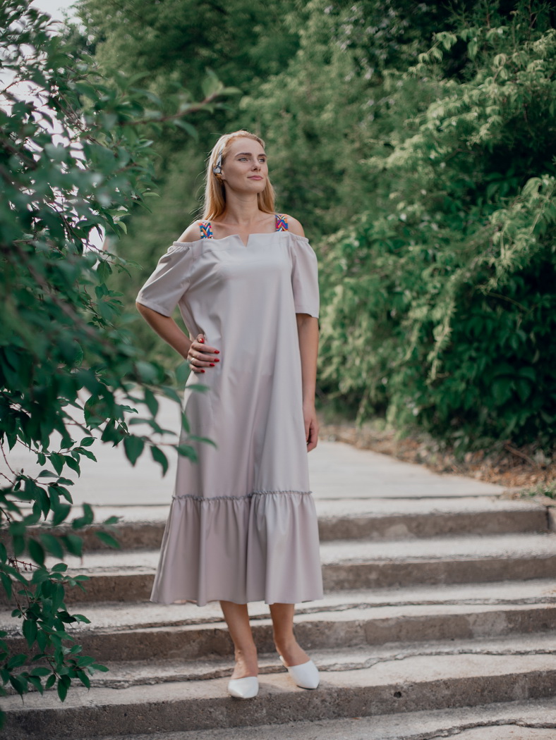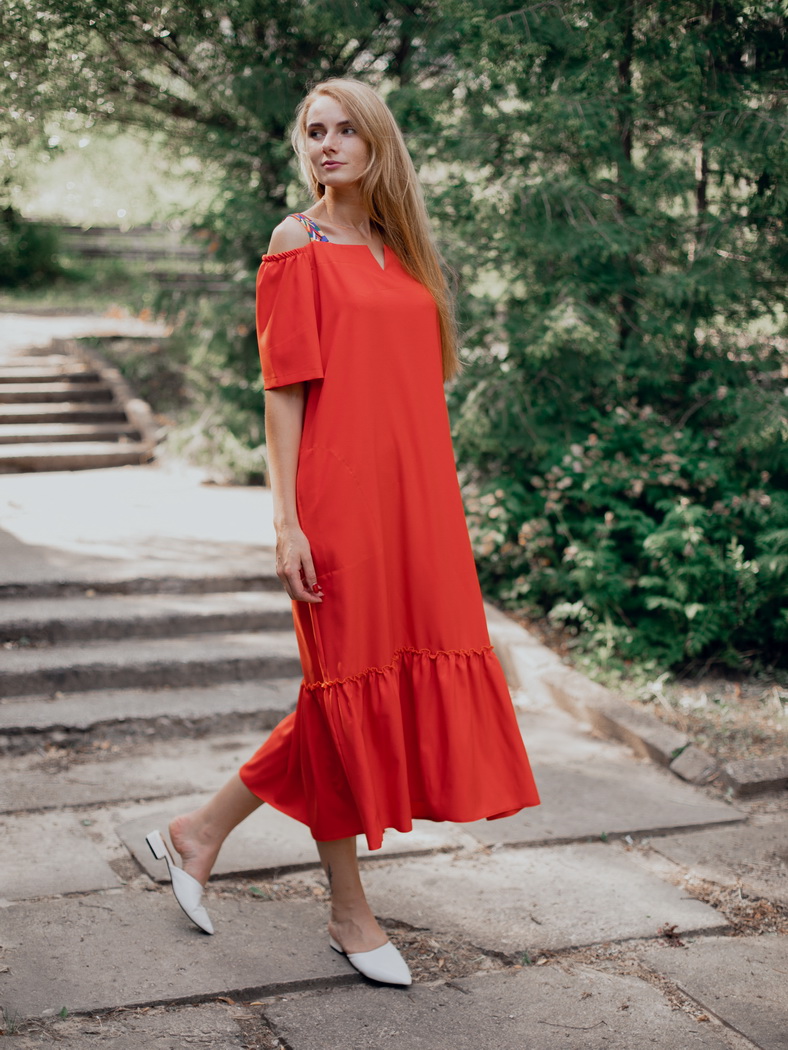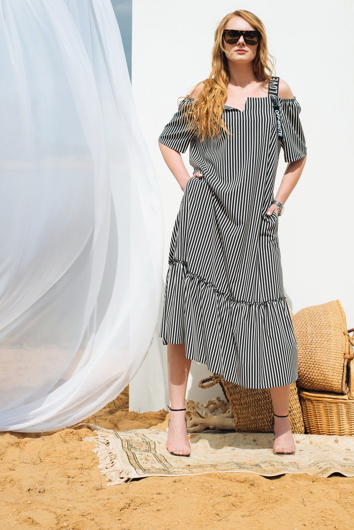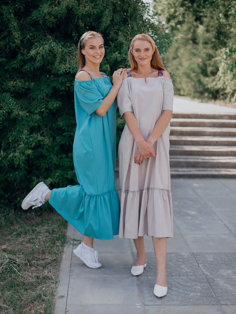 Платье длинное, слегка расширенного силуэта, на бретелях из отделочной тесьмы. перед открытый с V- образным разрезом. Спинка - открытая. По рукаву в верхней части резинка. Рукав - короткий. В боковых швах - карманы. По низу - широкий присборенный валан. С левой стороны переда под бретелью вставлена декоративная подвеска. Длина изделия : 127 см. Размеры: 48-54. Цвета: черно-белая полоска, черный, мята, морская волна, бежевый, коралловый. Состав: вискоза- 100%.