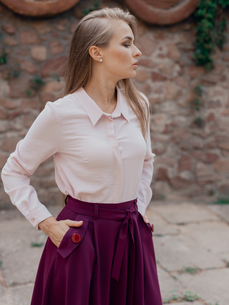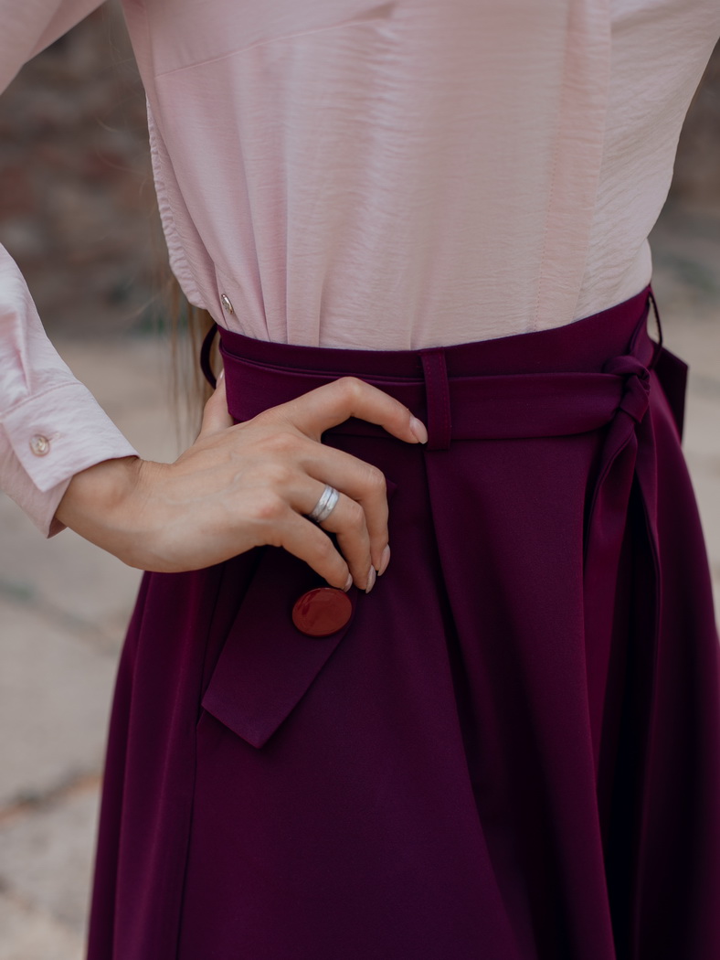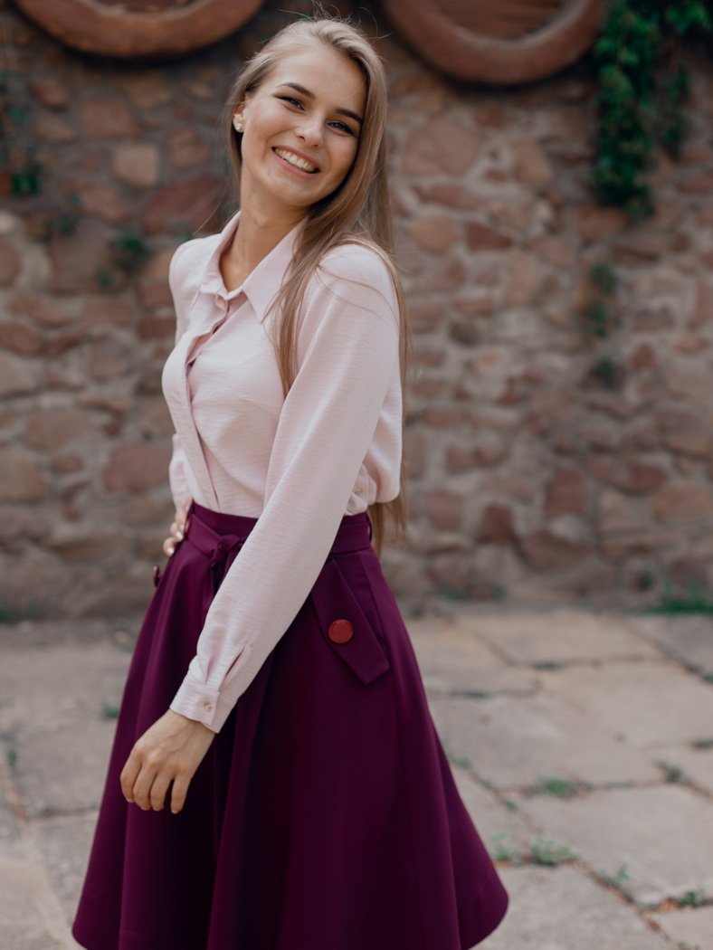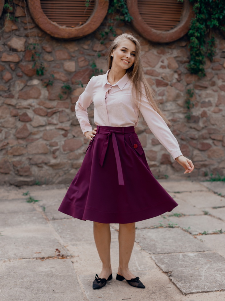 Юбка длиной за колено, полусолнце. Спереди мягкие складки от пояса. Карманы вертикальные с отложными клапанами на 2 пуговицы. По низу юбки отрезная деталь с отделочными строчками. На пояс настрочены шлевки, в которые вставлен завязывающийся пояс. Сзади застежка на потайную молнию..Цвета: бордо, черный, синий, баклажан. Размеры 44-50 .Длина изделия 60 см. Состав: 70% хлопок, 30% полиэстер