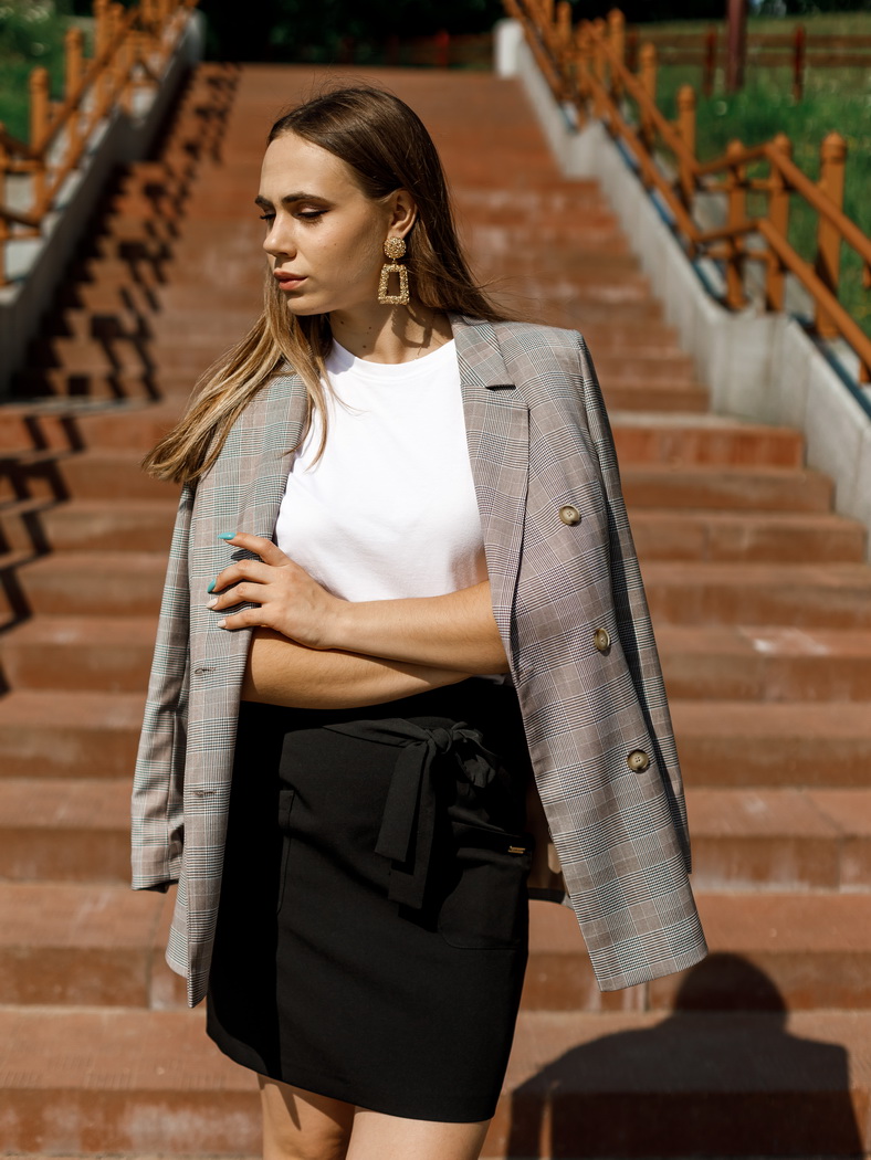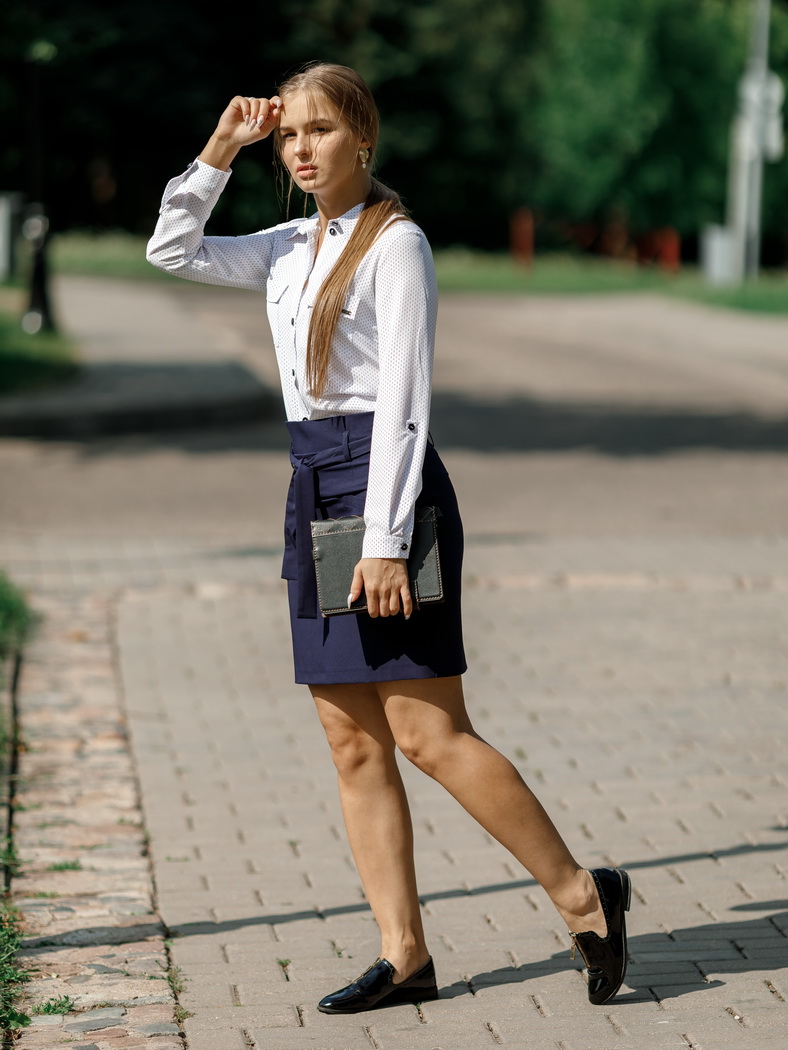 Юбка длиной до колена с завышенной талией, слегка расширенная к низу. Спереди накладные карманы. На поясе спереди 2 встречные складки.По юбке настрочены 4 шлевки, в которые продет завязывающийся пояс. Застежка в боковом шве на потайную молнию. Цвета: черный, синий. Размеры 42-48 .Длина изделия 44-47 см. Состав: 70% хлопок, 30% полиэстер