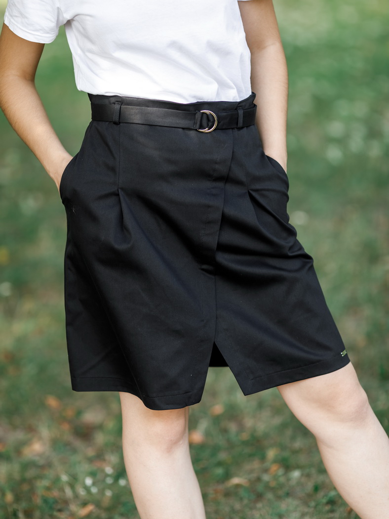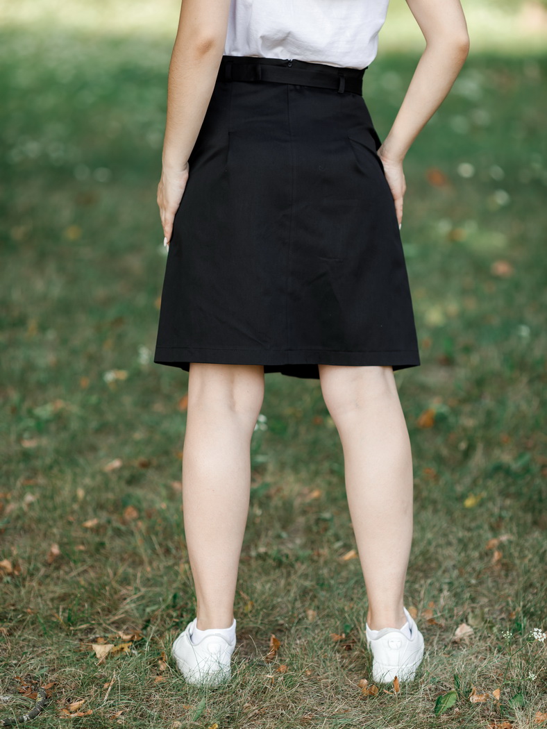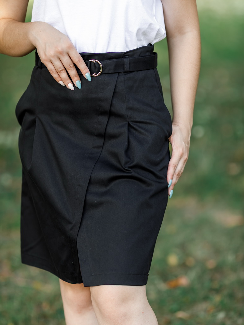 Юбка длиной до колена. Спереди и сзади по 2 застроченные мягкие складки. Застежка в среднем шве спинки на потайную молнию. Сверху настрочены шлевки, в которые продет пояс с застежкой на пряжку. В боковых швах - карманы Цвета: черный, синий. Размеры 42-48 .Длина изделия 57 см. Состав: 70% хлопок, 30% полиэстер