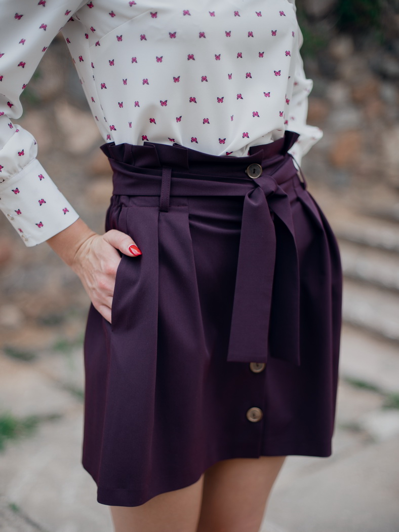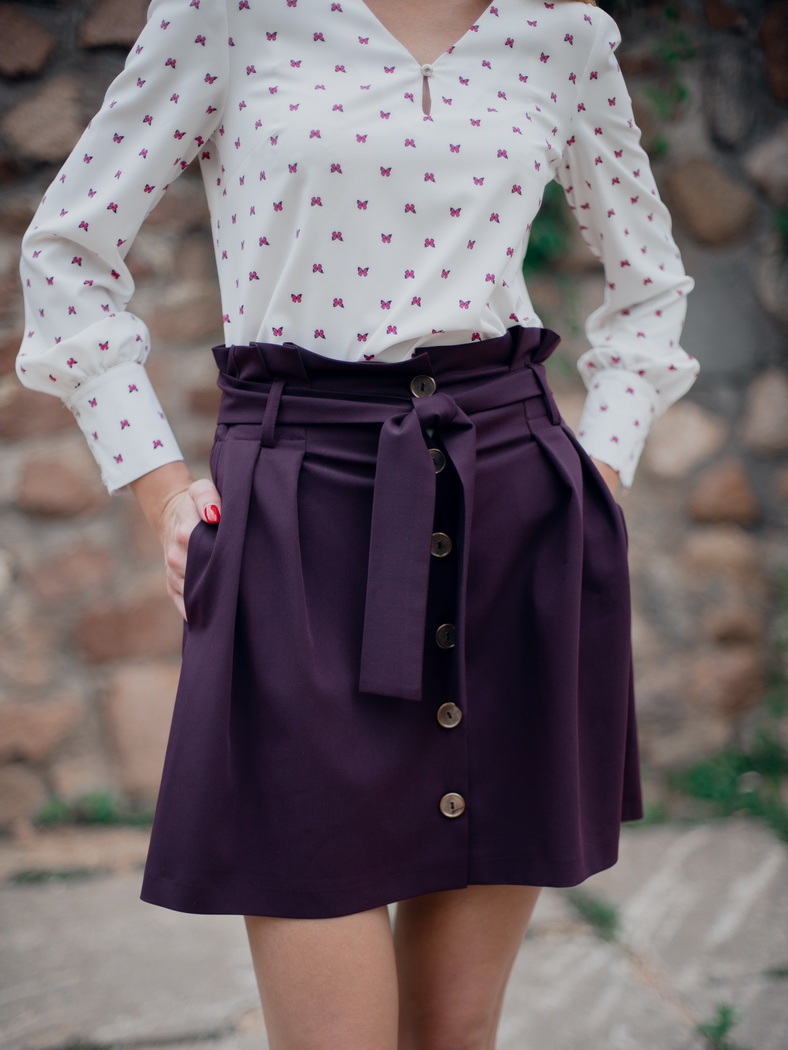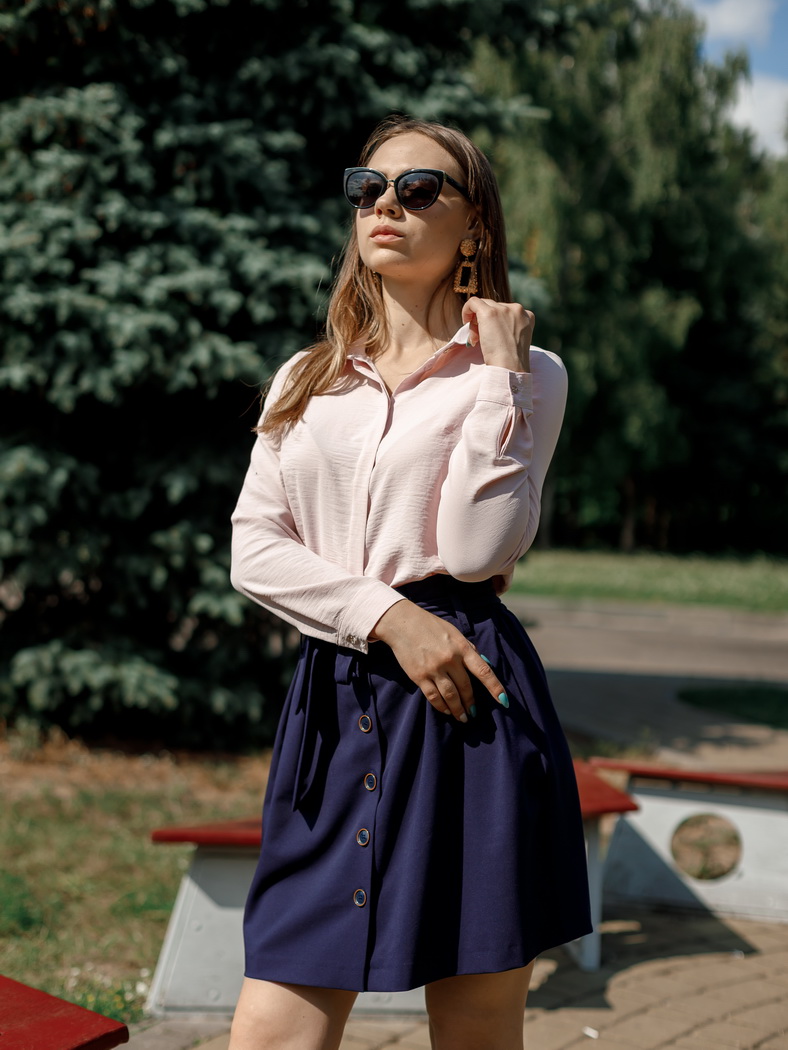 Юбка длиной до колена с завышенной талией. Спереди юбка на застежке ( 6 пуговиц). Сверху по переду застрочены мягкие складки; по спинке вставлена резинка.От верхнего среза, на расстоянии 3 см настрочены шлевки, в которые вставлен завязывающийся пояс. В боковых швах - карманы. Цвета: черный, синий. Размеры 42-48 .Длина изделия 47-50 см. Состав: 70% хлопок, 30% полиэстер