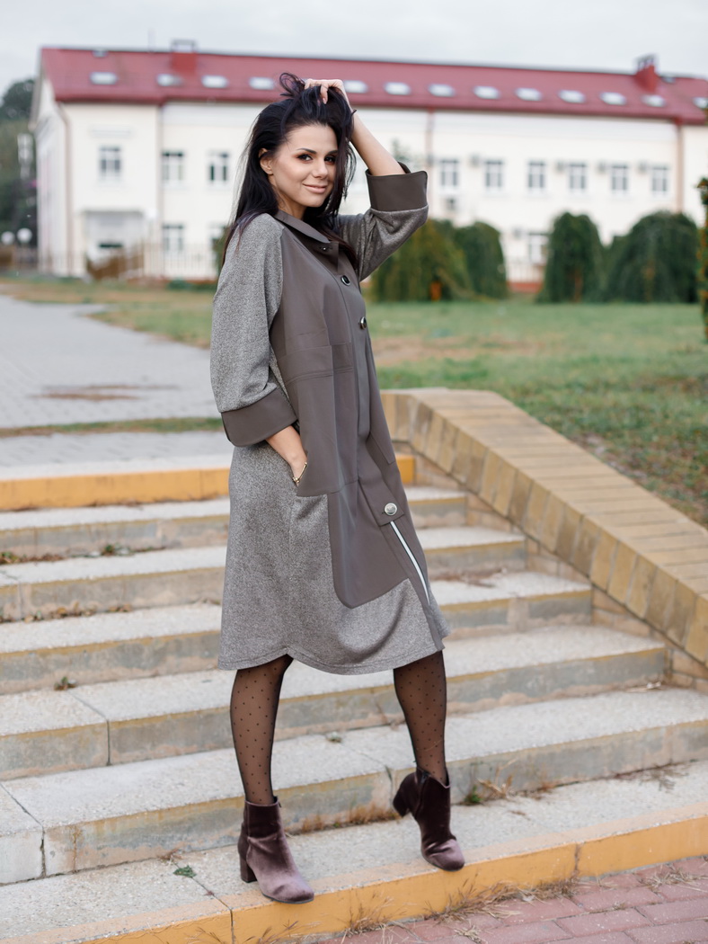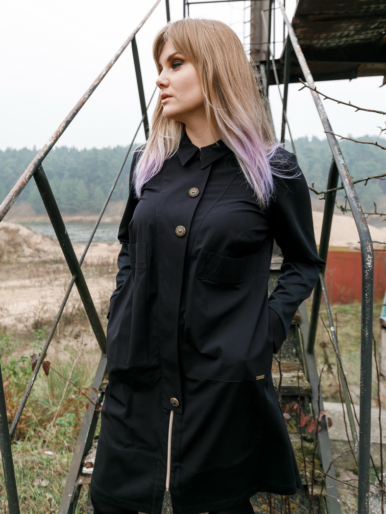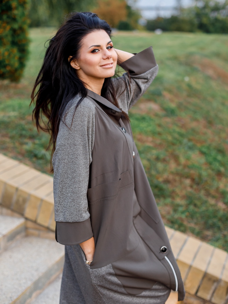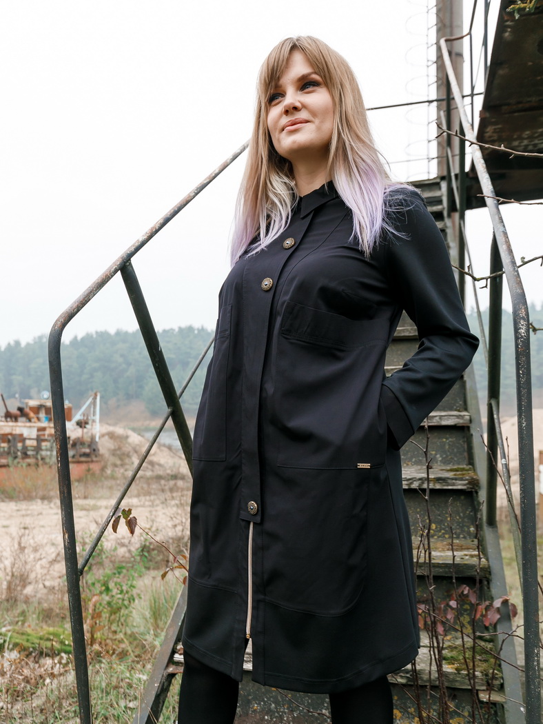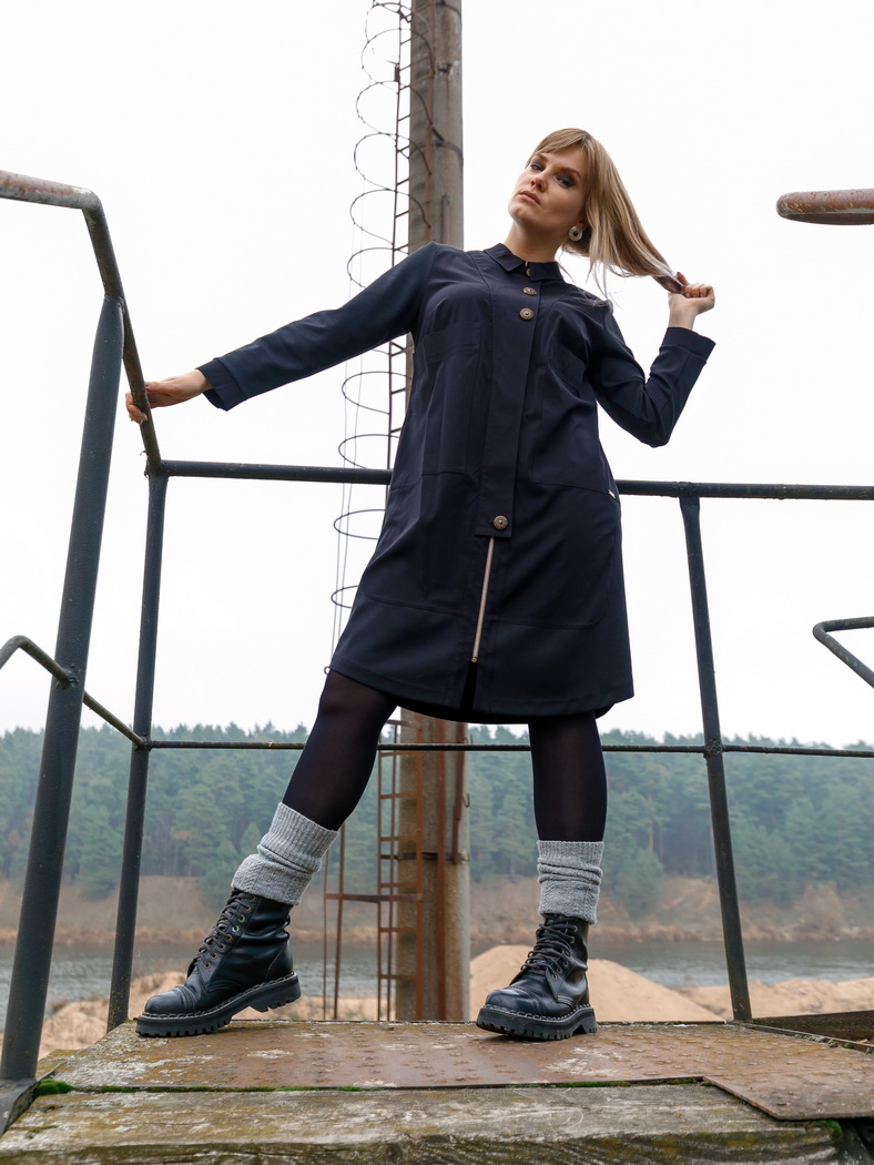 Платье прямого силуэта,длиной за колено с застежкой на молнию. Воротник - отложной. Платье состоит из двух тканей: хлопка и трикотажа. Спереди - застежка на длинную молнию. На правой половине переда отделочная планка с застежкой на 4 пуговицы По переду 2 больших накладных кармана. Рукава длинные, на манжете. Низ - фигурный. В боковых швах - карманы.Цвета: черный, синий. Размеры 48-56. Длина изделия 102 см. Состав: хлопок 70%, полиэстер 30%.