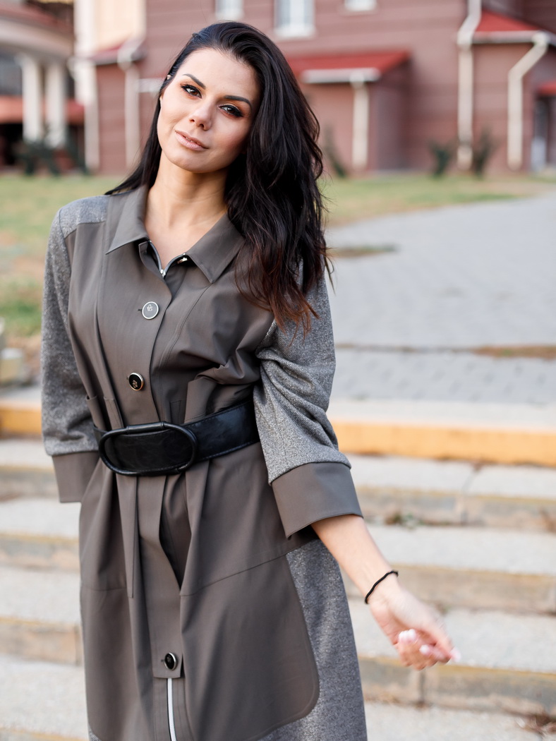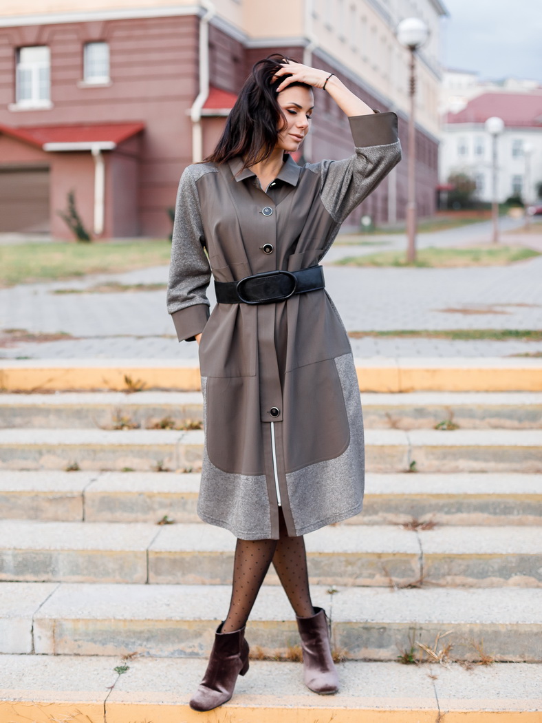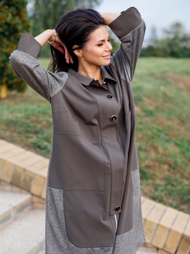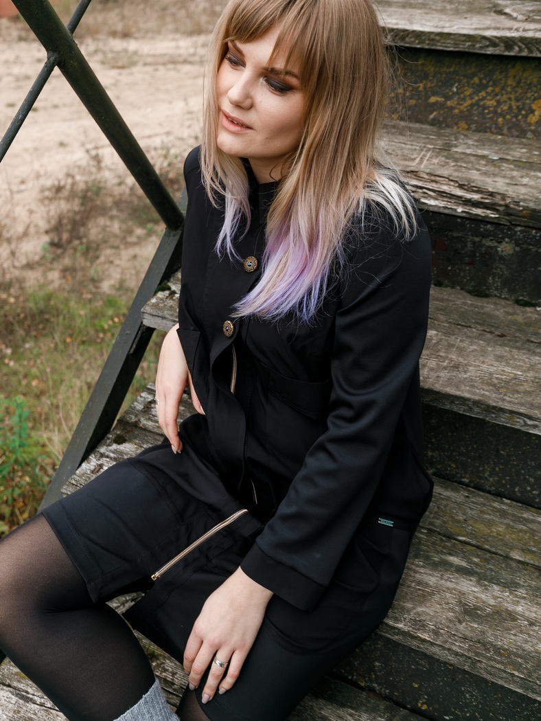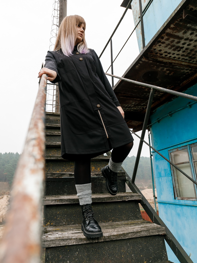 Платье прямого силуэта,длиной за колено с застежкой на молнию. Воротник - отложной. Платье состоит из двух тканей: хлопка и трикотажа. Спереди - застежка на длинную молнию. На правой половине переда отделочная планка с застежкой на 4 пуговицы По переду 2 больших накладных кармана. Рукава длинные, на манжете. Низ - фигурный. В боковых швах - карманы.Цвета: черный, синий. Размеры 48-56. Длина изделия 102 см. Состав: хлопок 70%, полиэстер 30%.