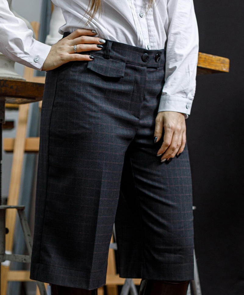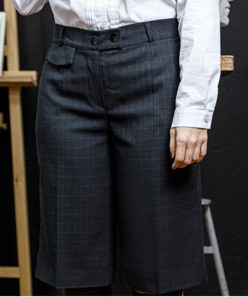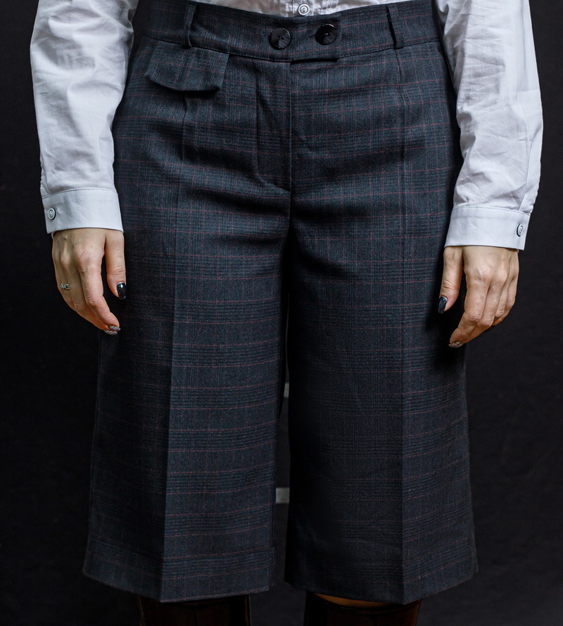 Шорты длиной за колено, распущенные к низу. По переду застежка на молнию. Карманы - хулиганы. С правой стороны под поясом отделочный клапан. На задней половинке - листочки-обманки. Пояс со шлевками. Цвета: черный; серая клетка, синяя клетка, бордо.Размеры 42-52.Длина изделия 65 см. Состав: 70%- хлопок, 30%- полиэстер.