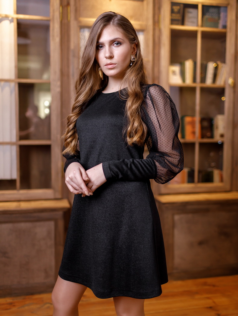 Платье прямого силуэта, слегка зауженное к низу, длиной до колена. Рукава - длинные, из гипюра, присборенные сверху, с высокими манжетами. Горловина - круглая. По спинке разрез с застежкой на 1 пуговицу. Цвета: черный, серый с перламутровым оттенком, бело-черная клетка. Размеры 42-48. Длина изделия - 86 см. Состав: хлопок 70%, полиэстер 30%.