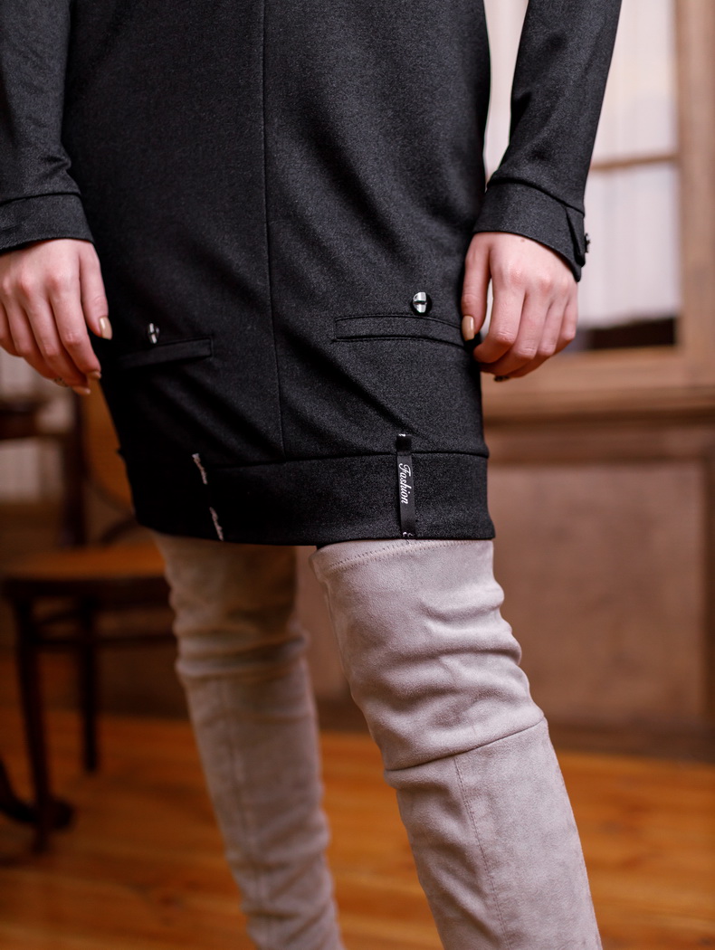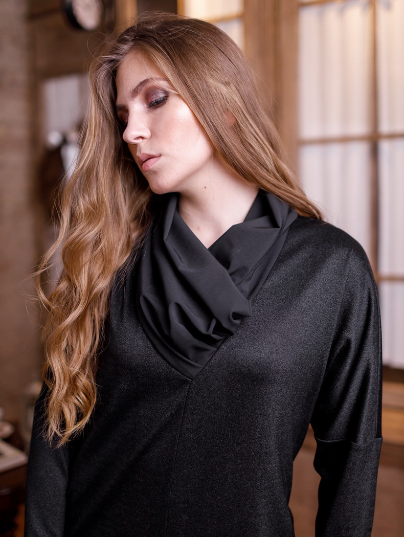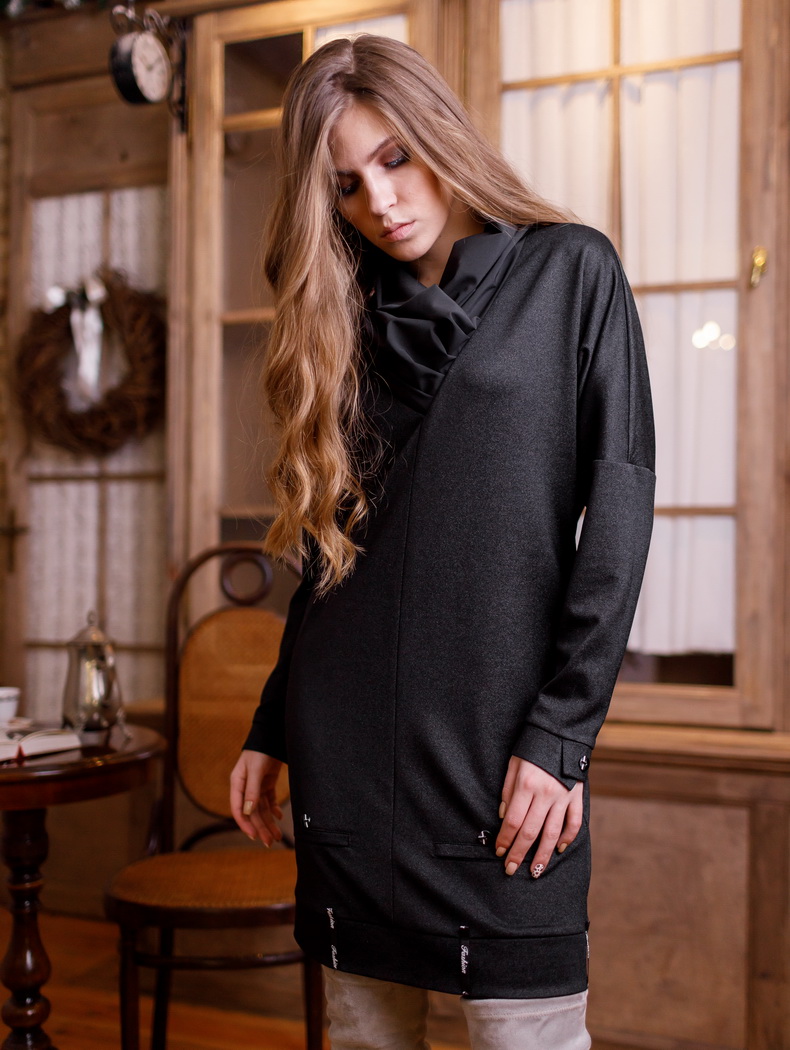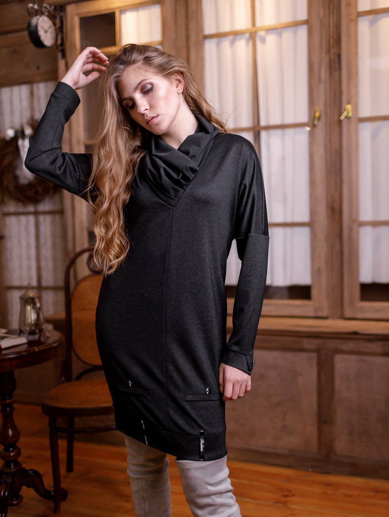 Платье полуприлегающего силуэта, длиной до колена. Рукава - длинные, с застежкой на манжеты (4 пуговицы). По низу переда имитация двух карманов. По низу спинки имитация гульфика с отделочными пуговицами (3 шт). По низу платья притачной пояс, на котором настрочены шлевки из отделочной тесьмы (6 шт). По переду - V-образная горловина. Воротник с мягкими складками Цвета: черный. Размеры 44-50. Длина изделия - 90-94 см. Состав: хлопок 70%, полиэстер 30%.