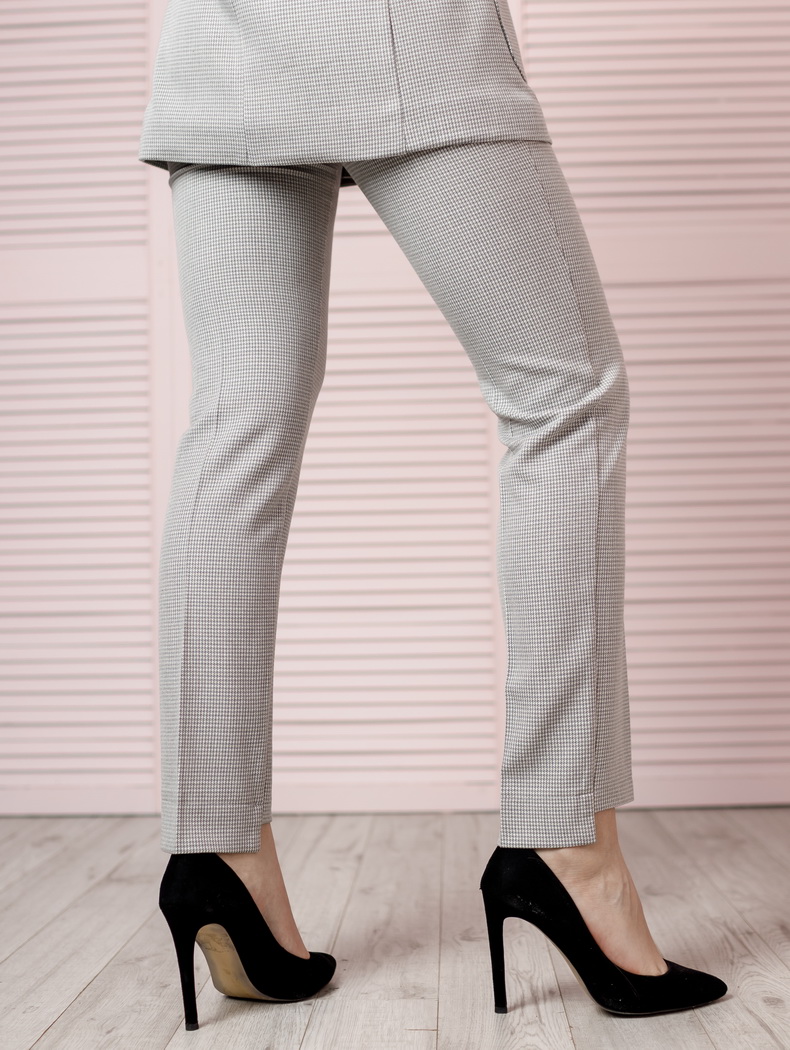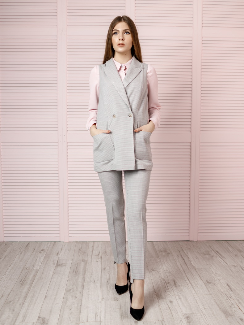 Брюки зауженные книзу с переходом ( спинка длиннее). По переду вертикальный карман - обманка с отделкой. По спинке - кокетка, из-под нее горизонтальные карманы - обманки с отделкой. Модель на поясе, на который настрочены шлевки. Цвета: черный, синий, серый в мелкую клетку. Размеры 42-52, 44-54. Длина изделия 100 см. Состав: 70% хлопок, 30% полиэстер .