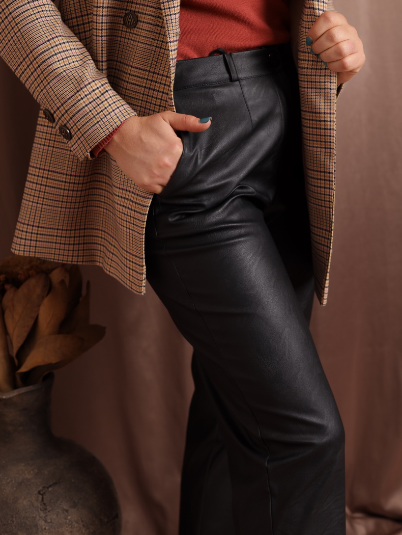 Брюки из эко-кожи, прямого силуэта, зауженные к низу. Застежка спереди на молнию. По переду карманы-хулиганы, по спинке с правой стороны карман-обманка с листочкой. Цвета: черный. Размеры 44-50. Длина изделия 99 см. Состав: 100% полиэстер .