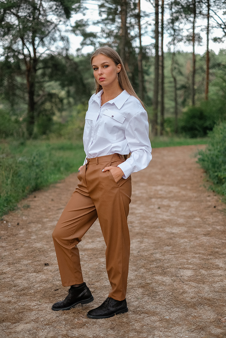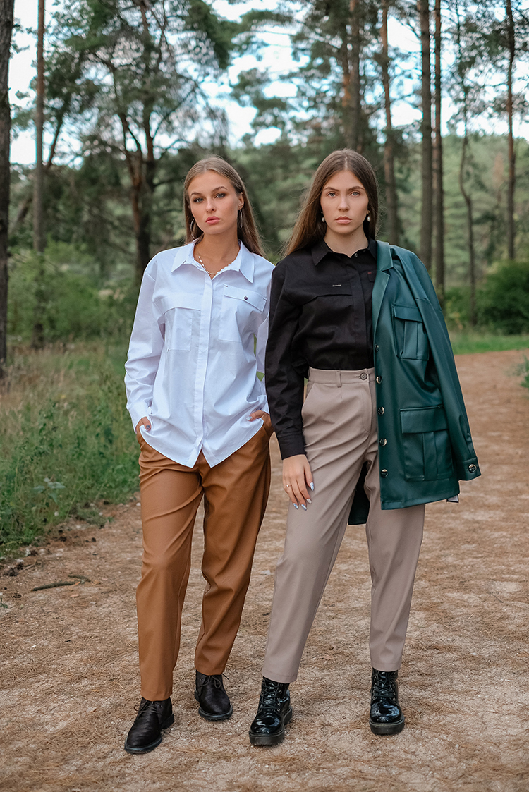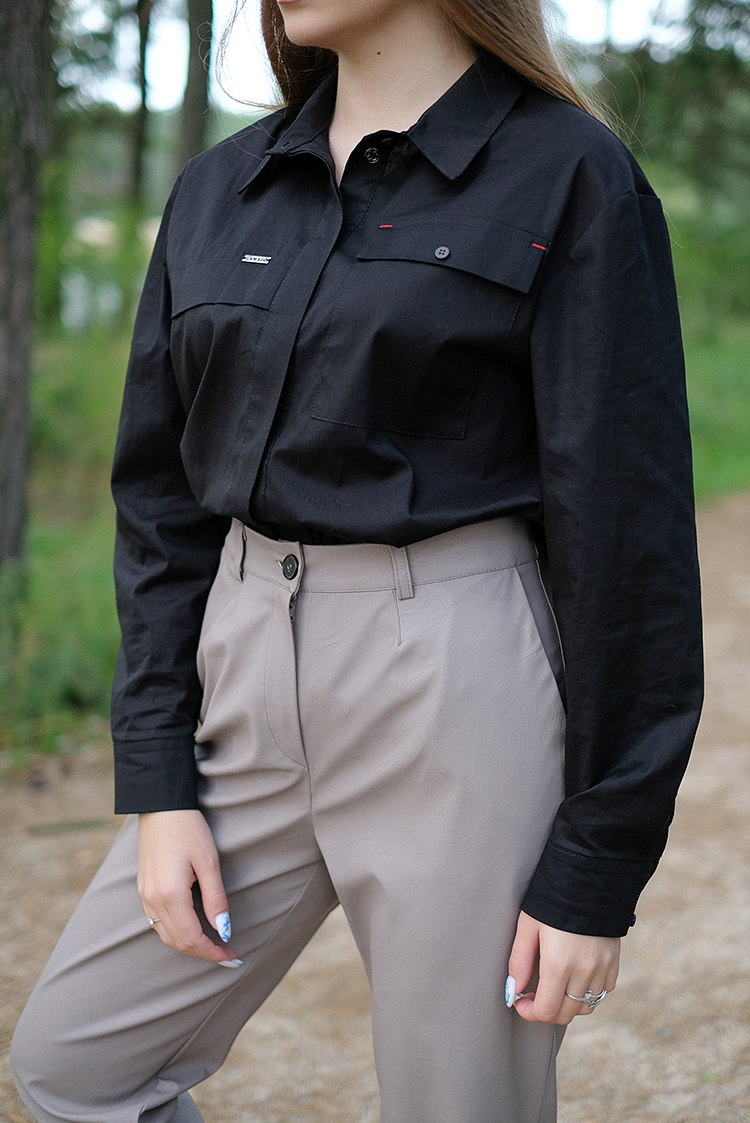 Блуза прямого силуэта, рукава заканчиваются с застежкой на одну пуговицу. Перед - потайная планка с застежкой на 8 пуговиц. Воротник обложкой на стойке. На спинке горизонтальная складка, в области груди накладные карманы.