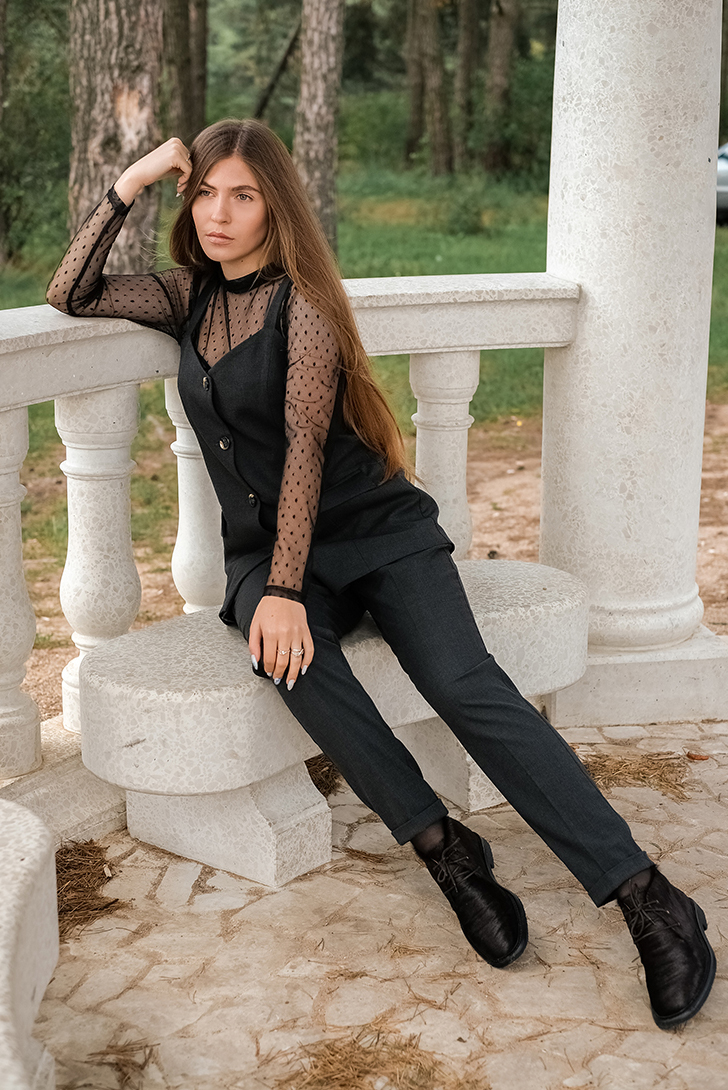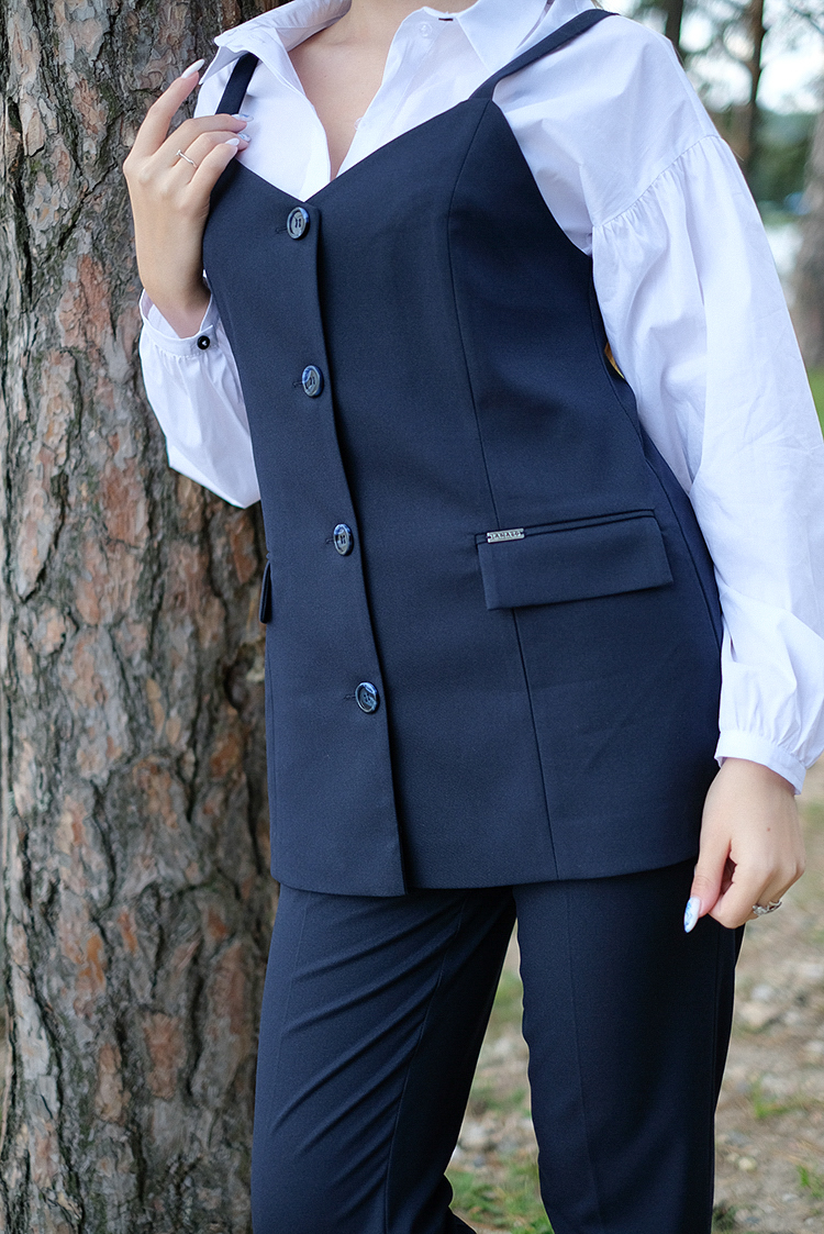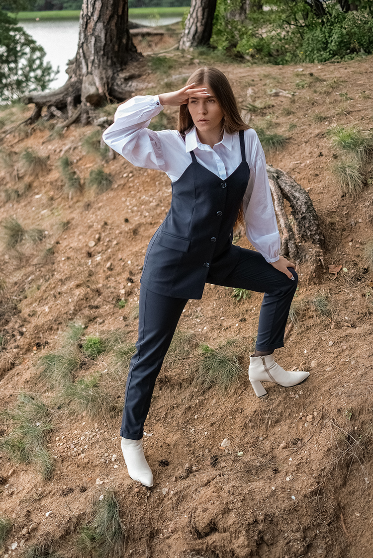 Жилет М 791 на подкладке, на бретелях с застежкой по переду на 4 пуговицы. Карманы прорезные в рамку с клапаном.