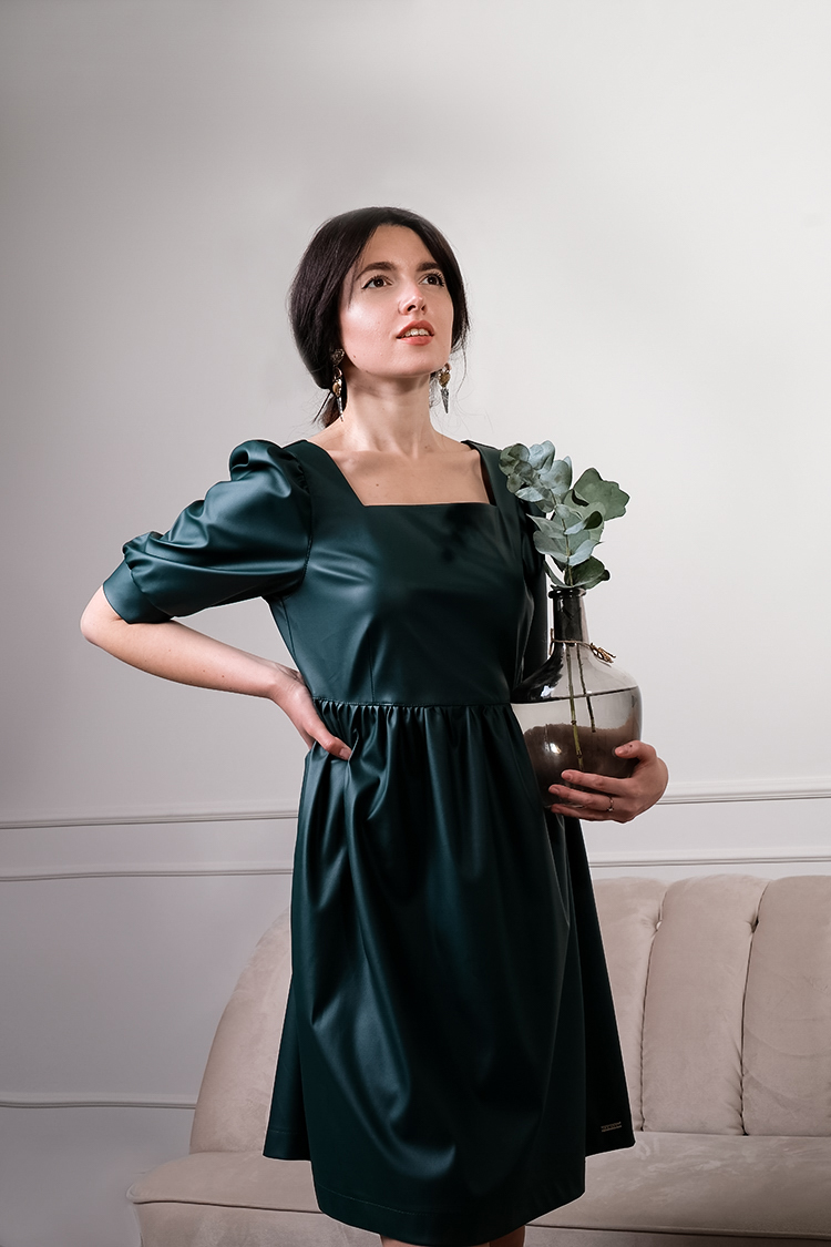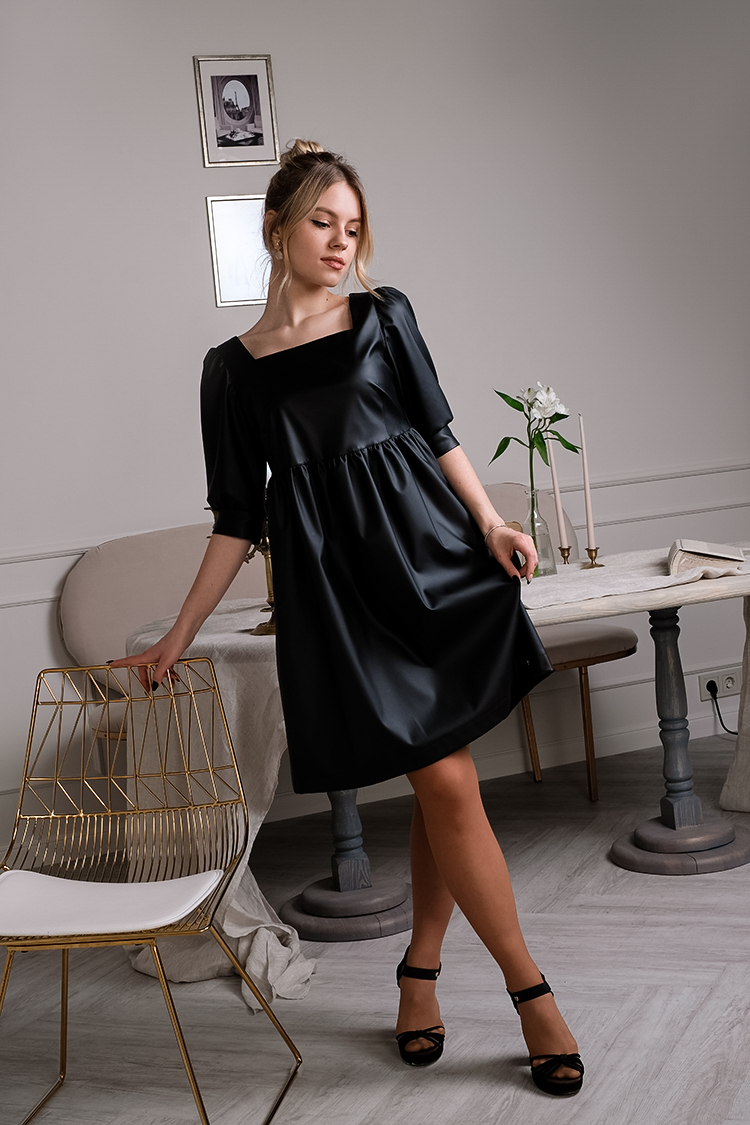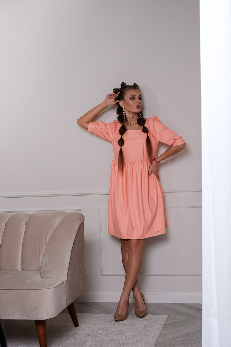 Платье расширенного силуэта, длиной до колена, с завышенной линией талии. Юбка сверху присборена, в боковых швах карманы. Вырез по переду и спинке квадратный. Застежка по спинке на потайную молнию, рукава 3/4 на манжеты, верх и низ рукавов присборенный.