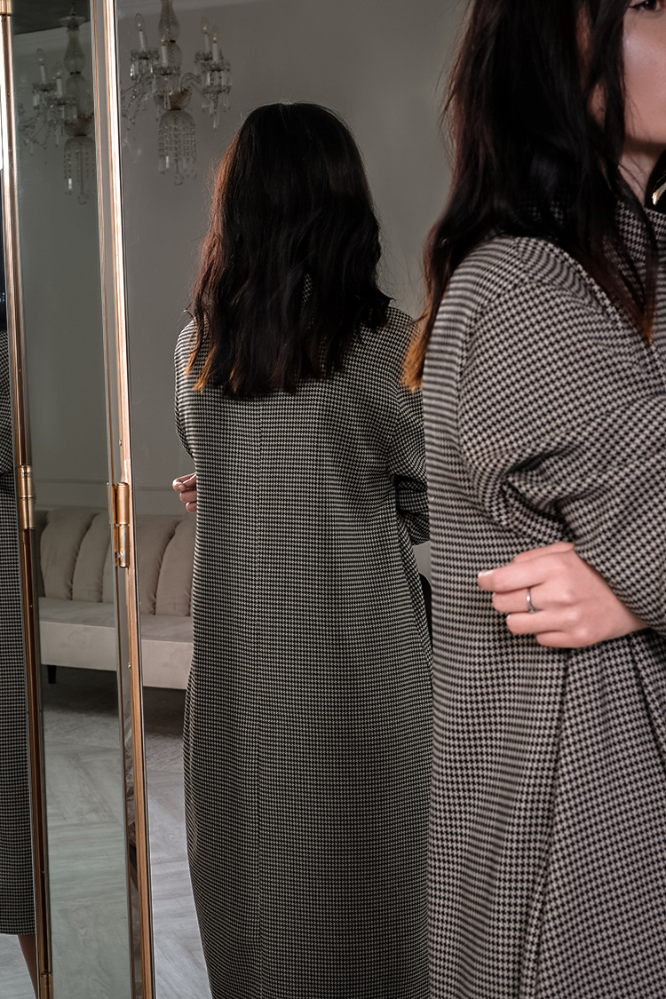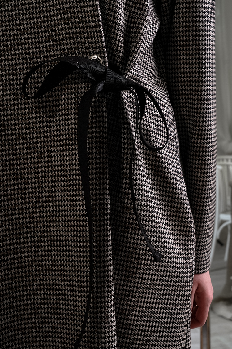 Платье расширенного к низу, длиной до колена. Рукава втачные длинные, воротник стойка. Застежка на две пуговицы, карманы в боковых швах. В области талии переда с левой стороны вставлены два люверса в которые продет отделочный пояс-завязка.