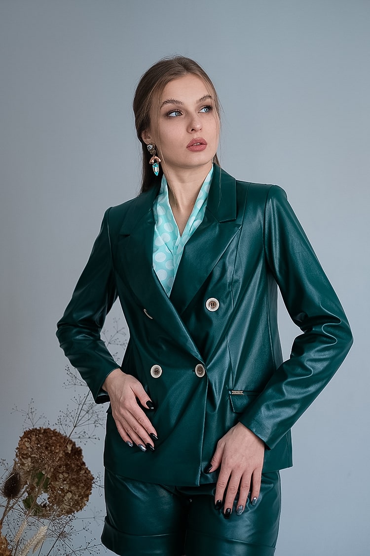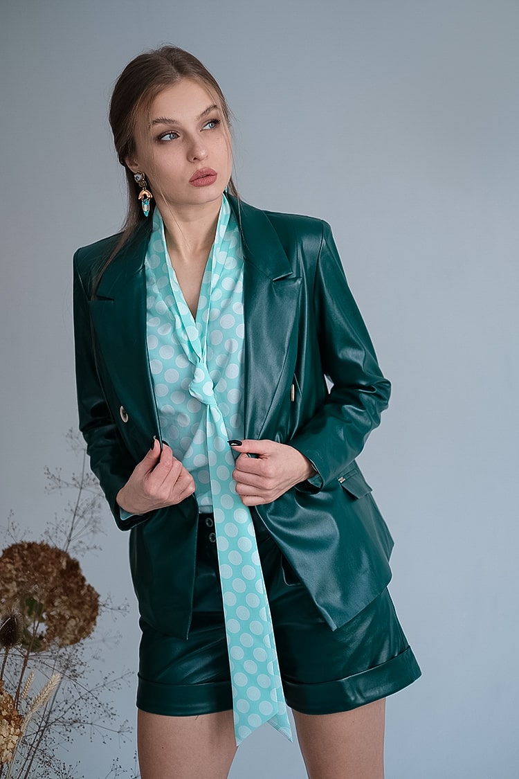 Шорты короткие из экокожи М 515, спереди - накладные карманы.По переду застежка на молнию и 2 пуговицы. Цвета: изумруд